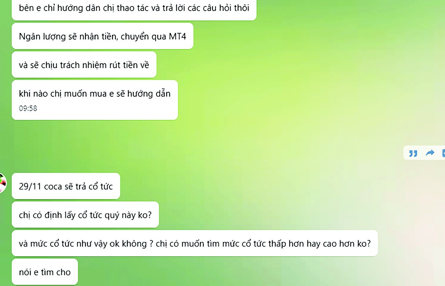 Để tạo niềm tin với chúng tôi, người này cam kết không nhận tiền và bất kỳ chi phí nào của khách hàng mà chỉ nhận lương từ công ty chứng khoán. Khi chúng tôi đề nghị để suy nghĩ thêm, anh ta “đánh vào tâm lý” về việc chia cổ tức, lợi nhuận, việc chia cổ tức bảo đảm theo mức cố định. Thậm chí, khi chúng tôi nói để bàn bạc lại với gia đình, anh ta vẫn hối thúc, nên mua cổ phiếu của Coca Cola để nhận cổ tức nhanh nhất và gửi bảng chia cổ tức.
