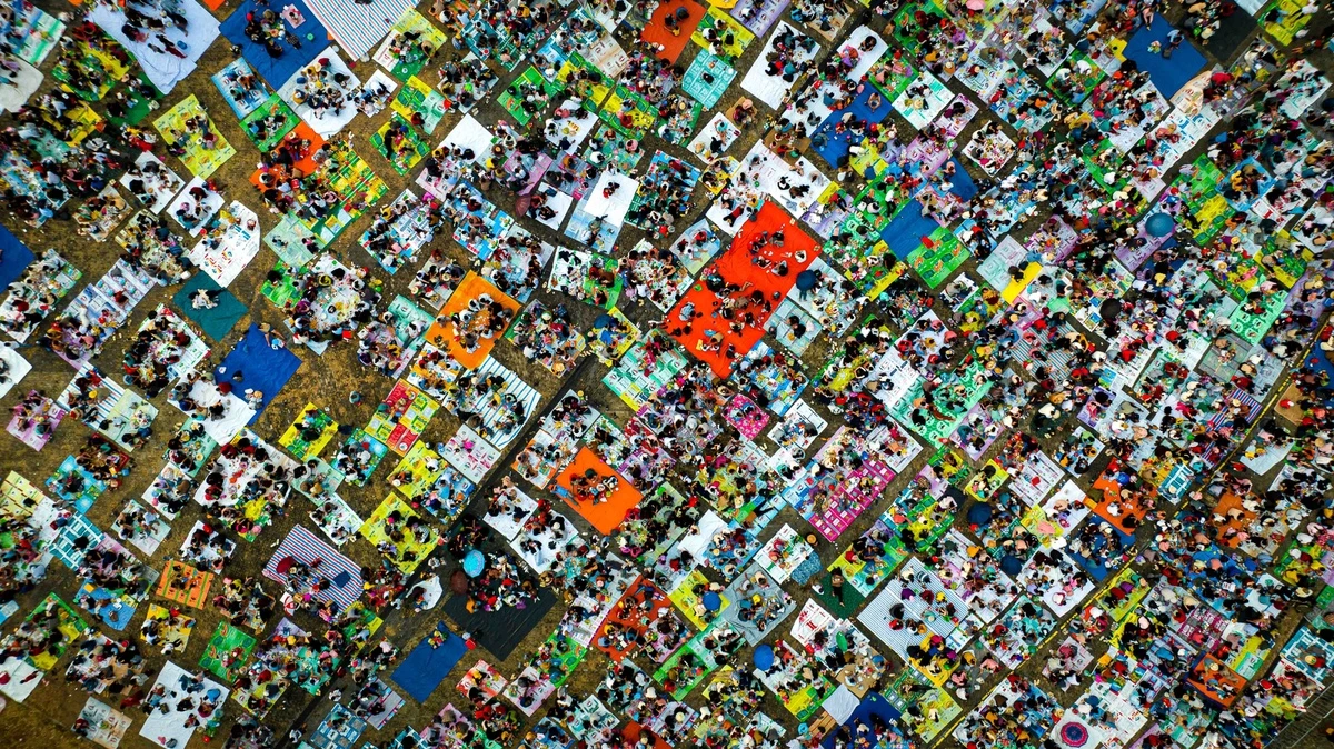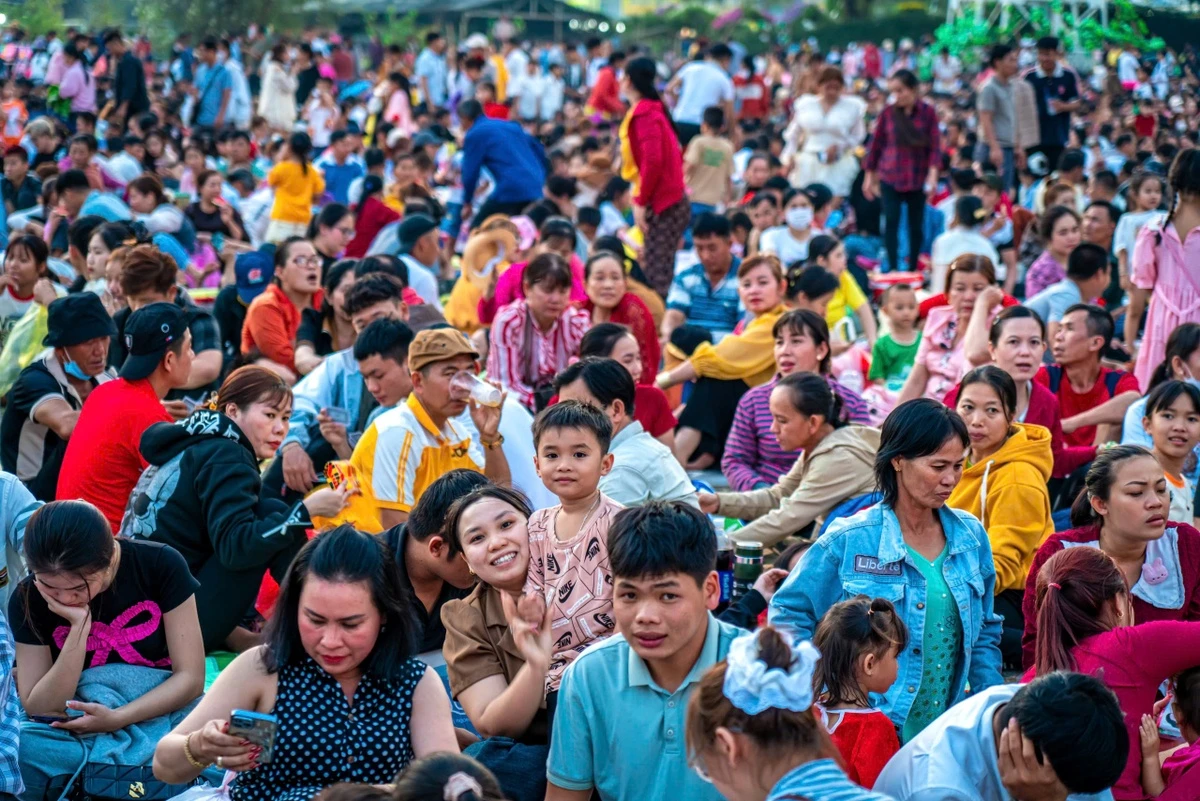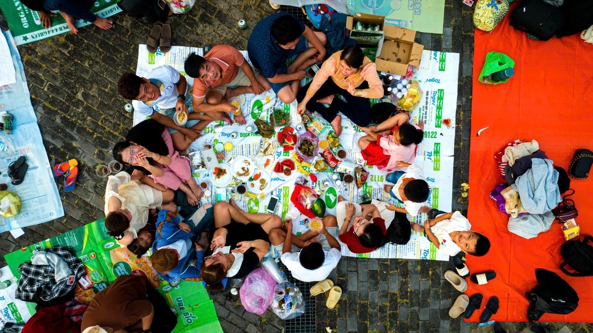 Nhiều người dân trải bạt ra sân để ngồi quây quần ăn uống, trò chuyện, chờ xem pháo hoa và biểu diễn nghệ thuật, tạo ra bức tranh ấn tượng với nhiều màu sắc.