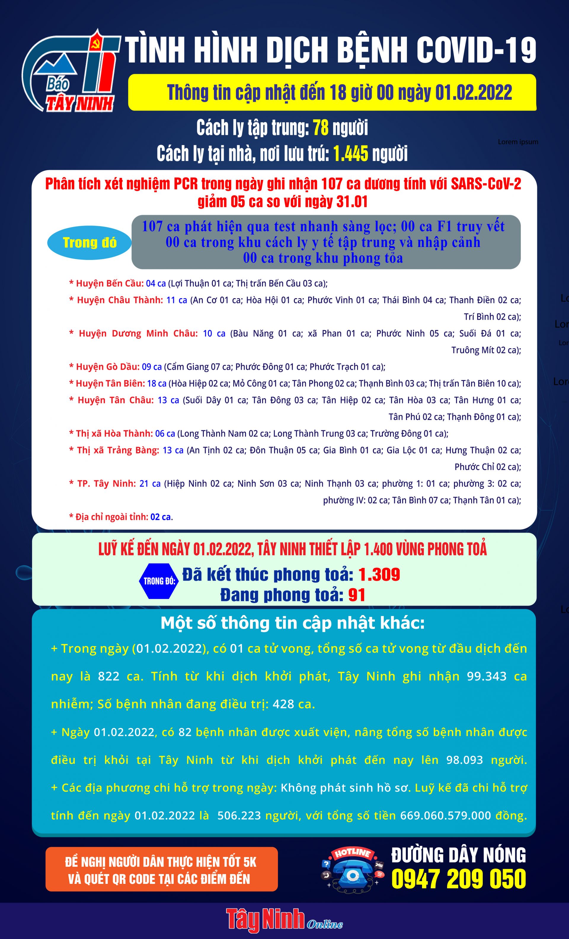 Ngày 01.02.2022, có 82 bệnh nhân được xuất viện, nâng tổng số bệnh nhân được điều trị khỏi tại Tây Ninh từ khi dịch khởi phát đến nay lên 98.093 người.