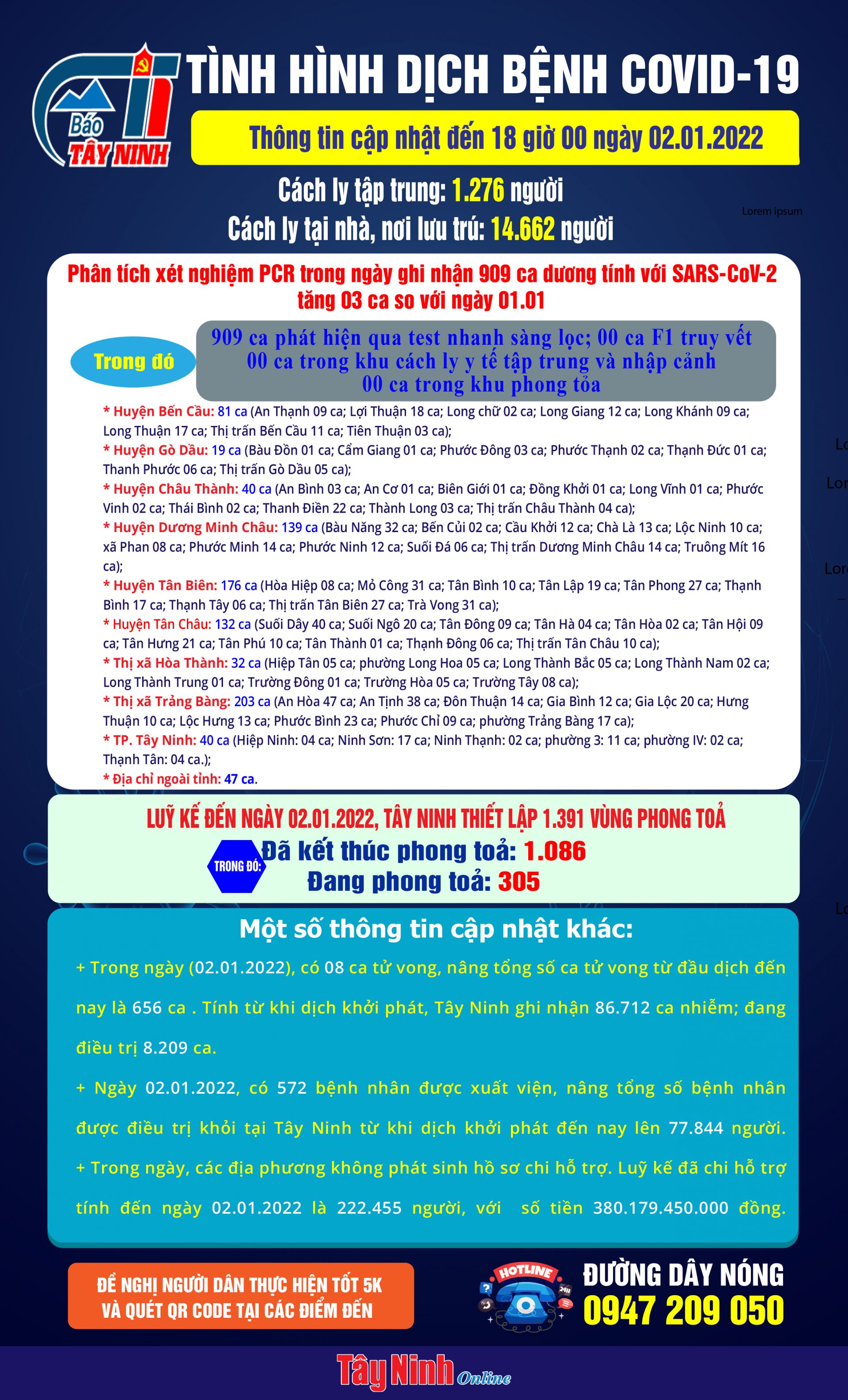 Ngày 02.01.2022, có 572 bệnh nhân được xuất viện, nâng tổng số bệnh nhân được điều trị khỏi tại Tây Ninh từ khi dịch khởi phát đến nay lên 77.844 người.