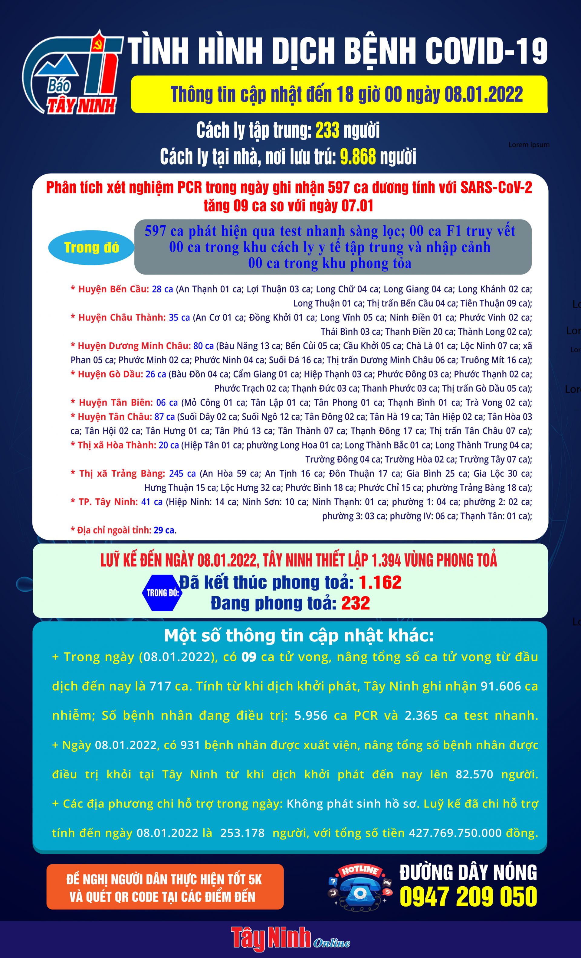 Ngày 08.01.2022, có 931 bệnh nhân được xuất viện, nâng tổng số bệnh nhân được điều trị khỏi tại Tây Ninh từ khi dịch khởi phát đến nay lên 82.570 người.