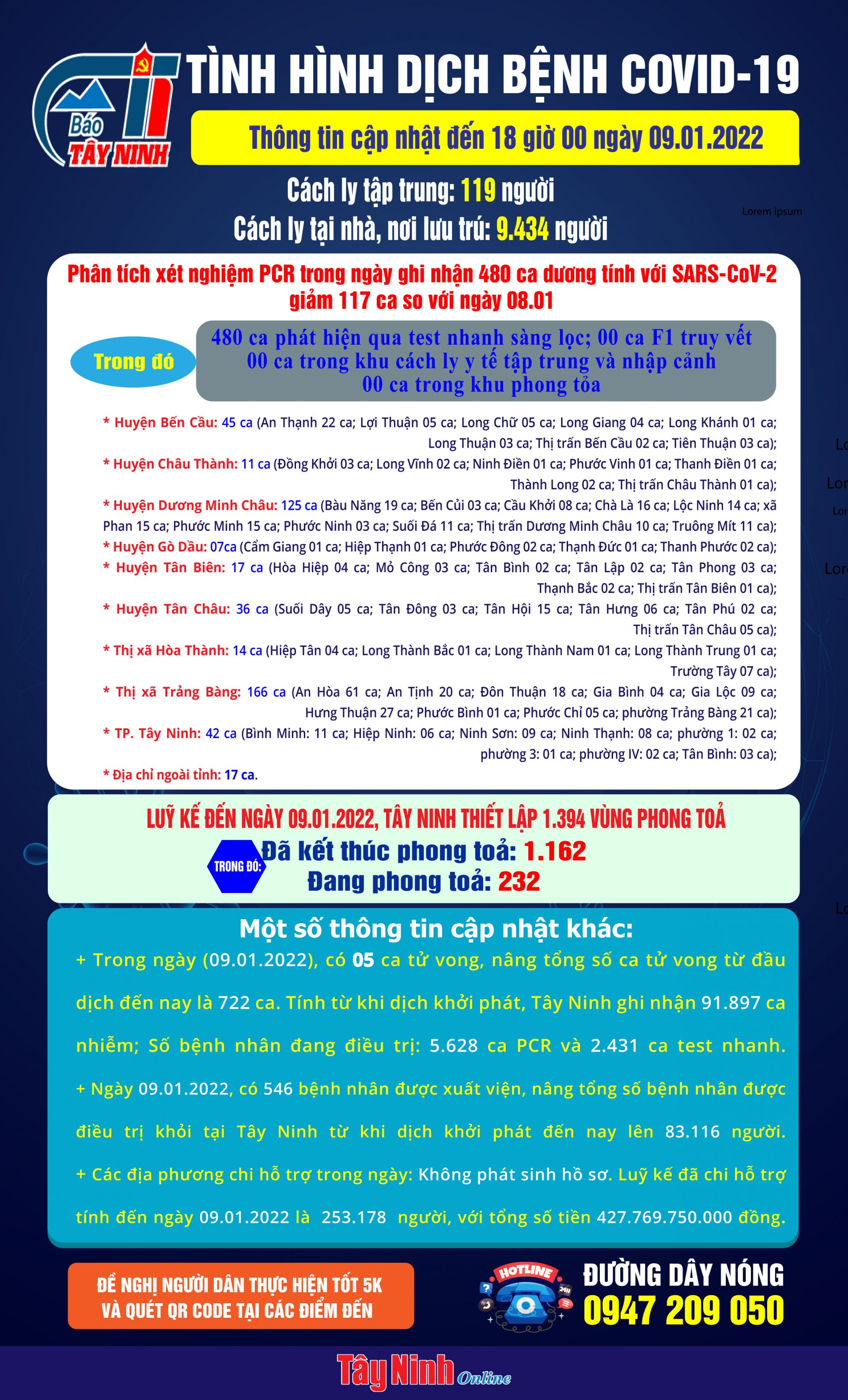 Ngày 09.01.2022, có 546 bệnh nhân được xuất viện, nâng tổng số bệnh nhân được điều trị khỏi tại Tây Ninh từ khi dịch khởi phát đến nay lên 83.116 người.