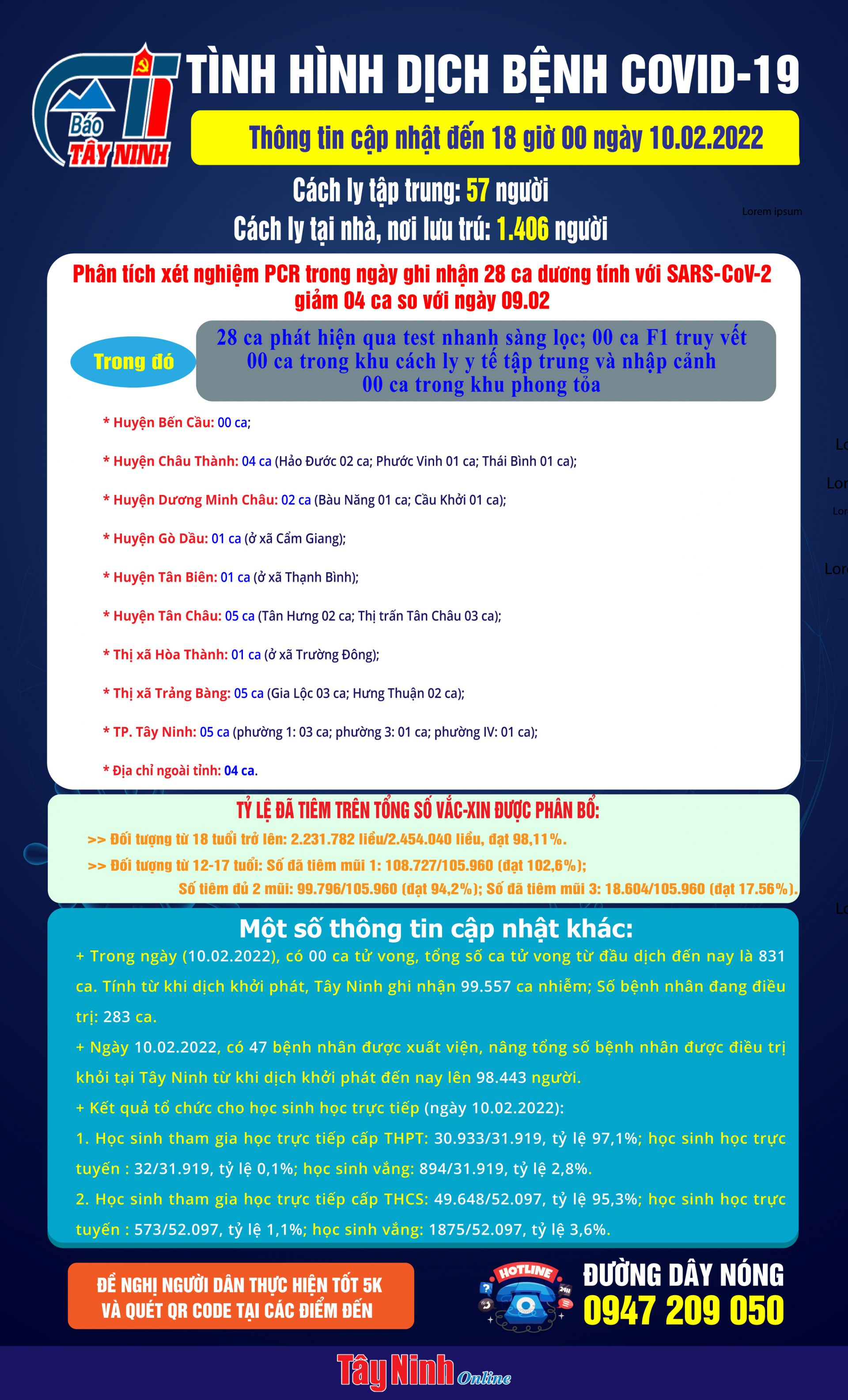 Ngày 10.02.2022, có 47 bệnh nhân được xuất viện, nâng tổng số bệnh nhân được điều trị khỏi tại Tây Ninh từ khi dịch khởi phát đến nay lên 98.443 người.