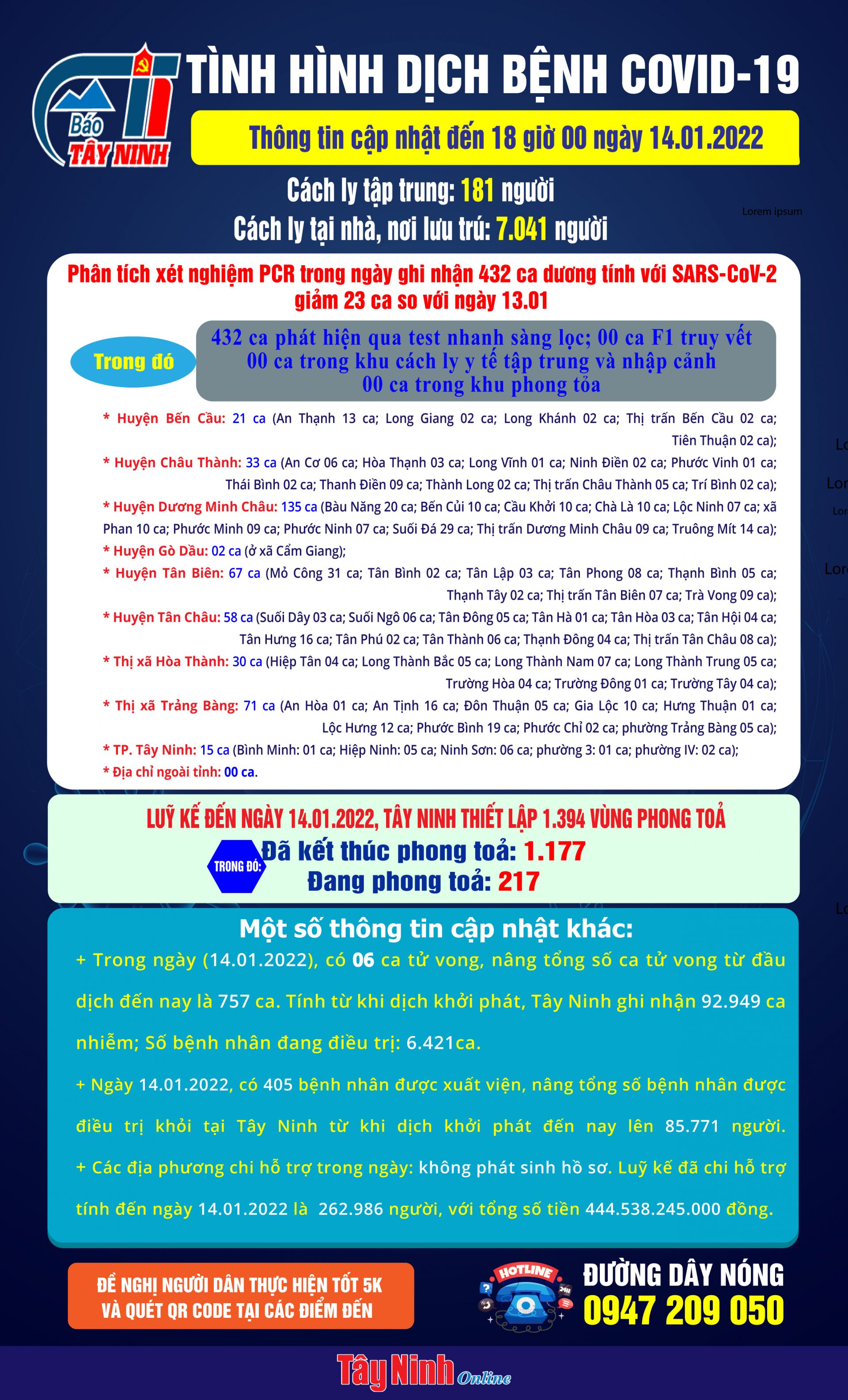 Ngày 14.01.2022, có 405 bệnh nhân được xuất viện, nâng tổng số bệnh nhân được điều trị khỏi tại Tây Ninh từ khi dịch khởi phát đến nay lên 85.771 người.