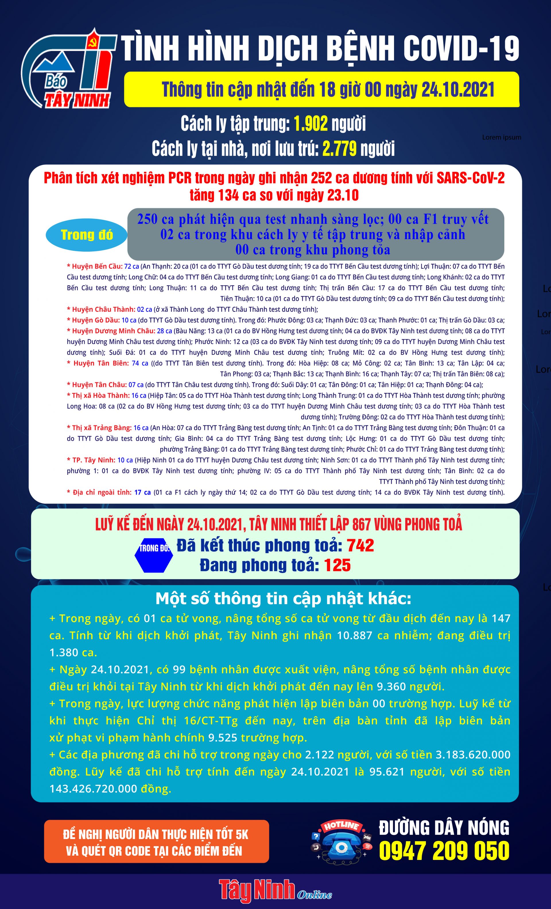 Ngày 24.10.2021, có 99 bệnh nhân được xuất viện, nâng tổng số bệnh nhân được điều trị khỏi tại Tây Ninh từ khi dịch khởi phát đến nay lên 9.360 người.
