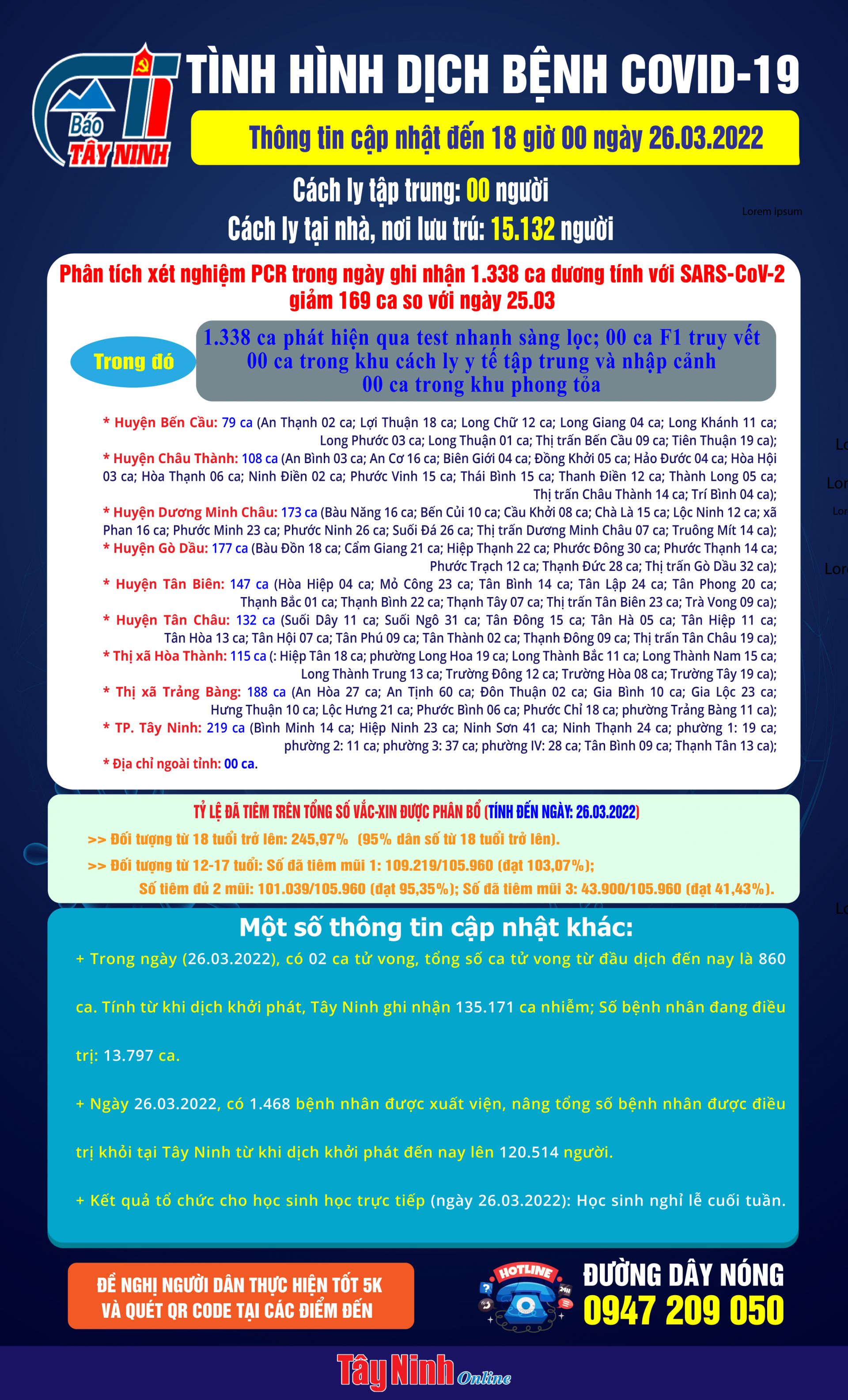 Ngày 26.03.2022, có 1.468 bệnh nhân được xuất viện, nâng tổng số bệnh nhân được điều trị khỏi tại Tây Ninh từ khi dịch khởi phát đến nay lên 120.514 người.