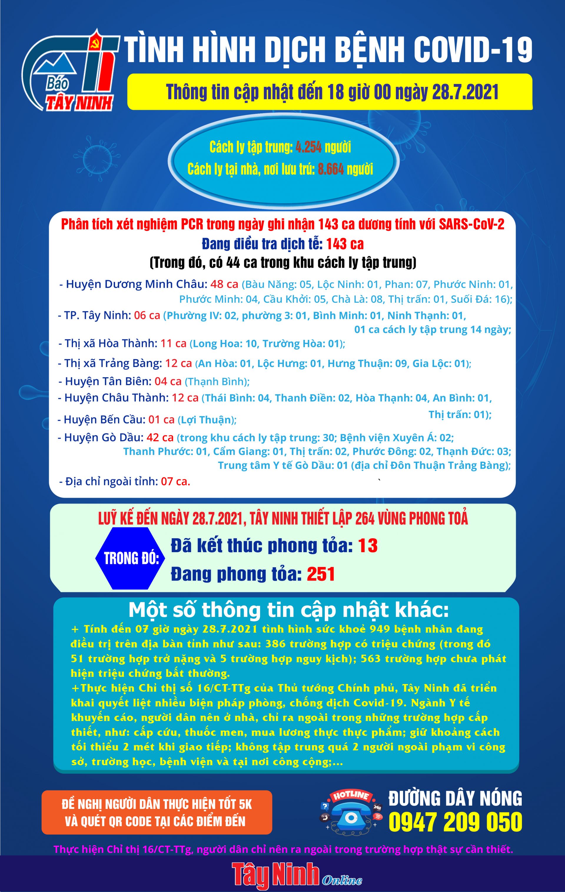 Trong ngày, Tây Ninh ghi nhận 2 ca tử vong mới ở huyện Gò Dầu và Dương Minh Châu. Luỹ kế, từ khi dịch khởi phát, trên địa bàn tỉnh có 11 ca tử vong do Covid-19.