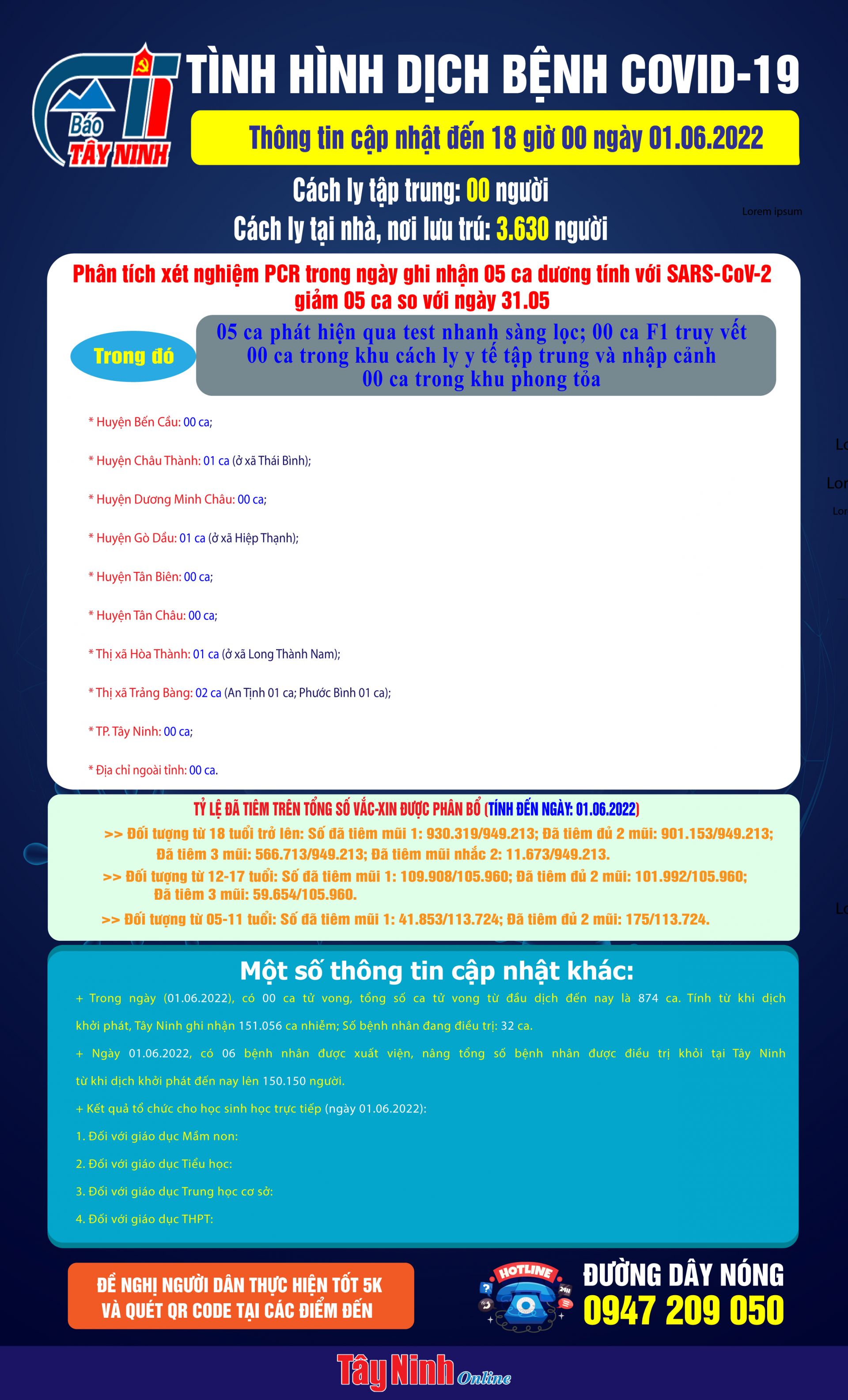 Ngày 01.06.2022, có 06 bệnh nhân được xuất viện, nâng tổng số bệnh nhân được điều trị khỏi tại Tây Ninh từ khi dịch khởi phát đến nay lên 150.150 người.