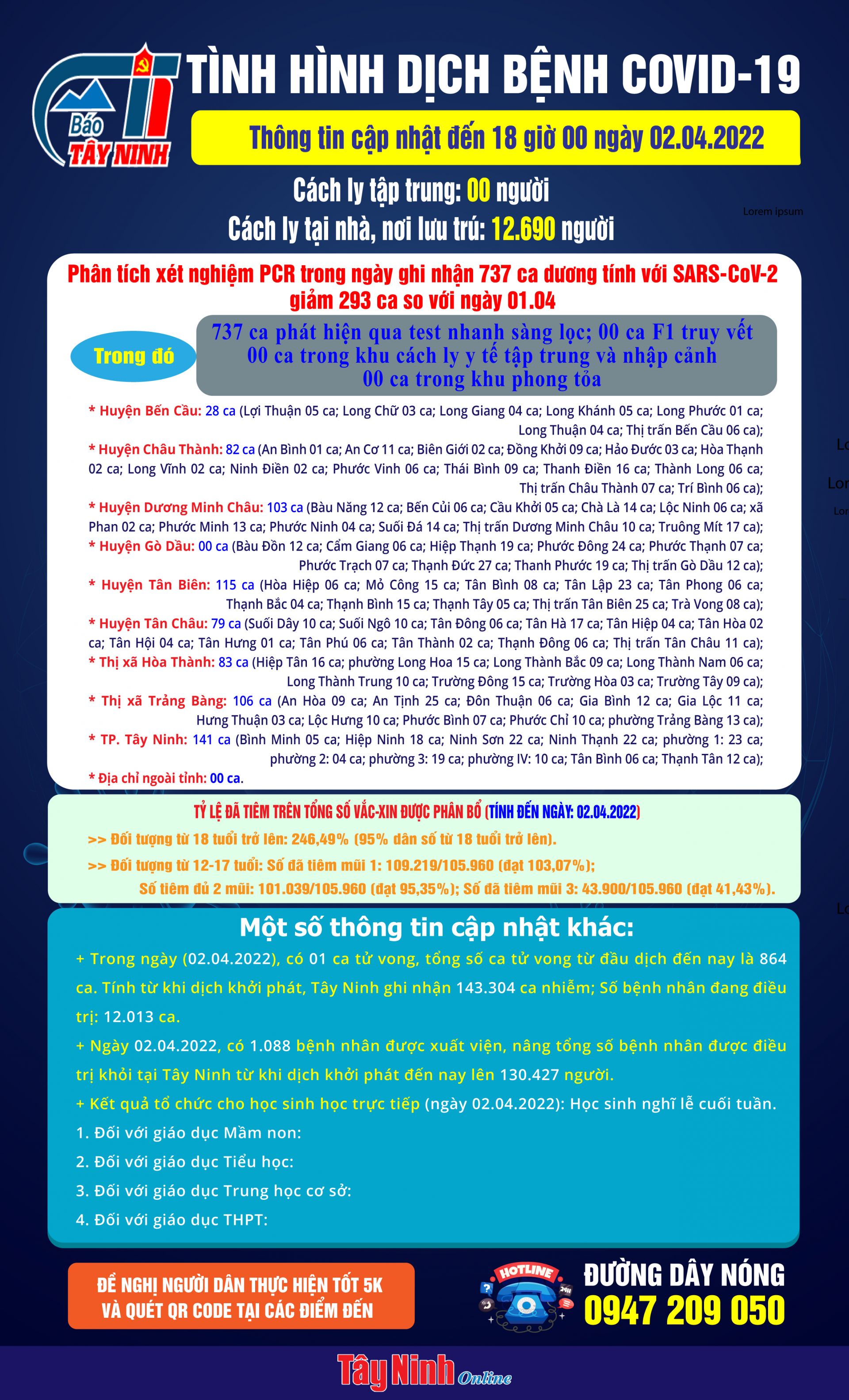 Ngày 02.04.2022, có 1.088 bệnh nhân được xuất viện, nâng tổng số bệnh nhân được điều trị khỏi tại Tây Ninh từ khi dịch khởi phát đến nay lên 130.427 người.