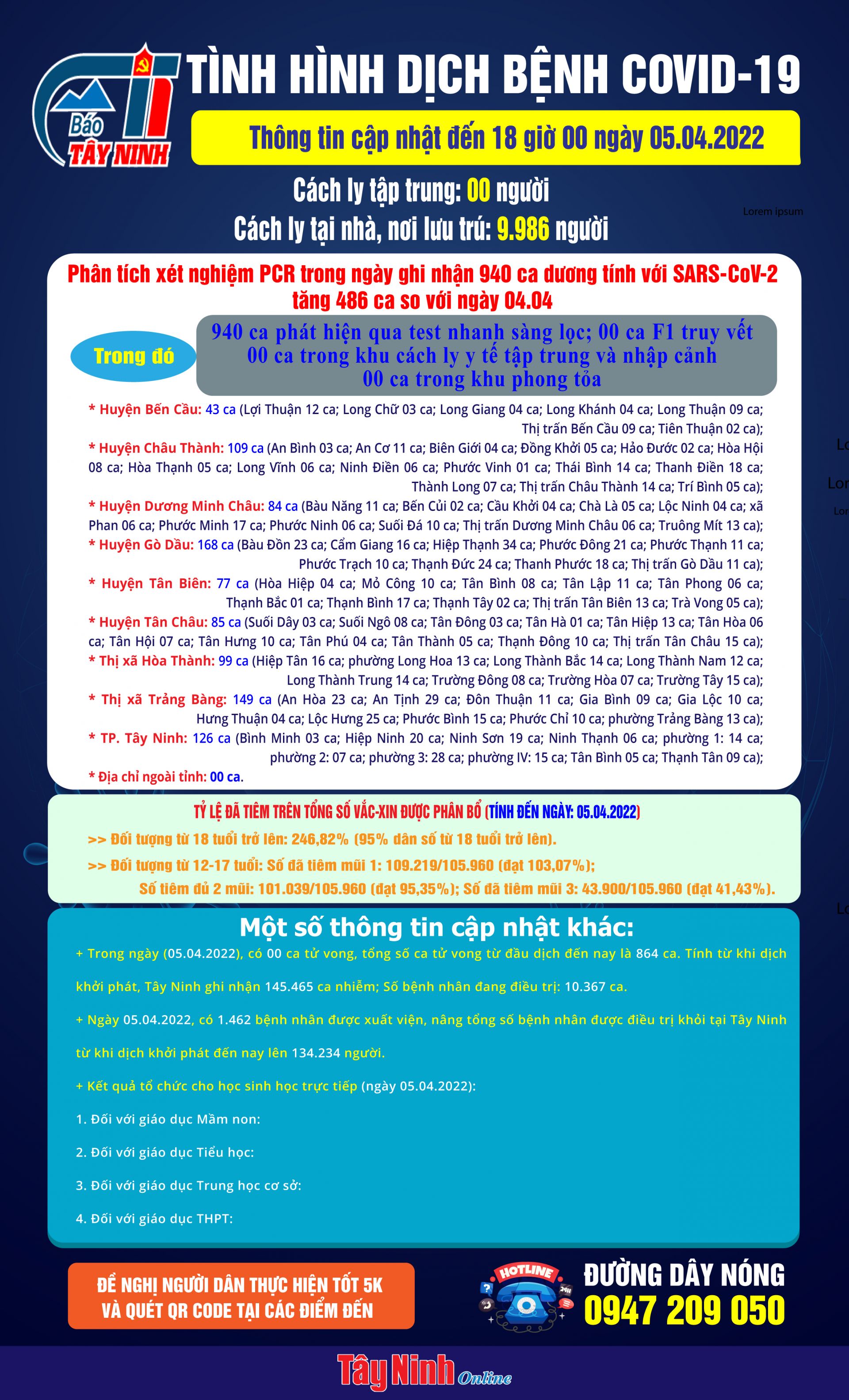 Ngày 05.04.2022, có 1.462 bệnh nhân được xuất viện, nâng tổng số bệnh nhân được điều trị khỏi tại Tây Ninh từ khi dịch khởi phát đến nay lên 134.234 người.