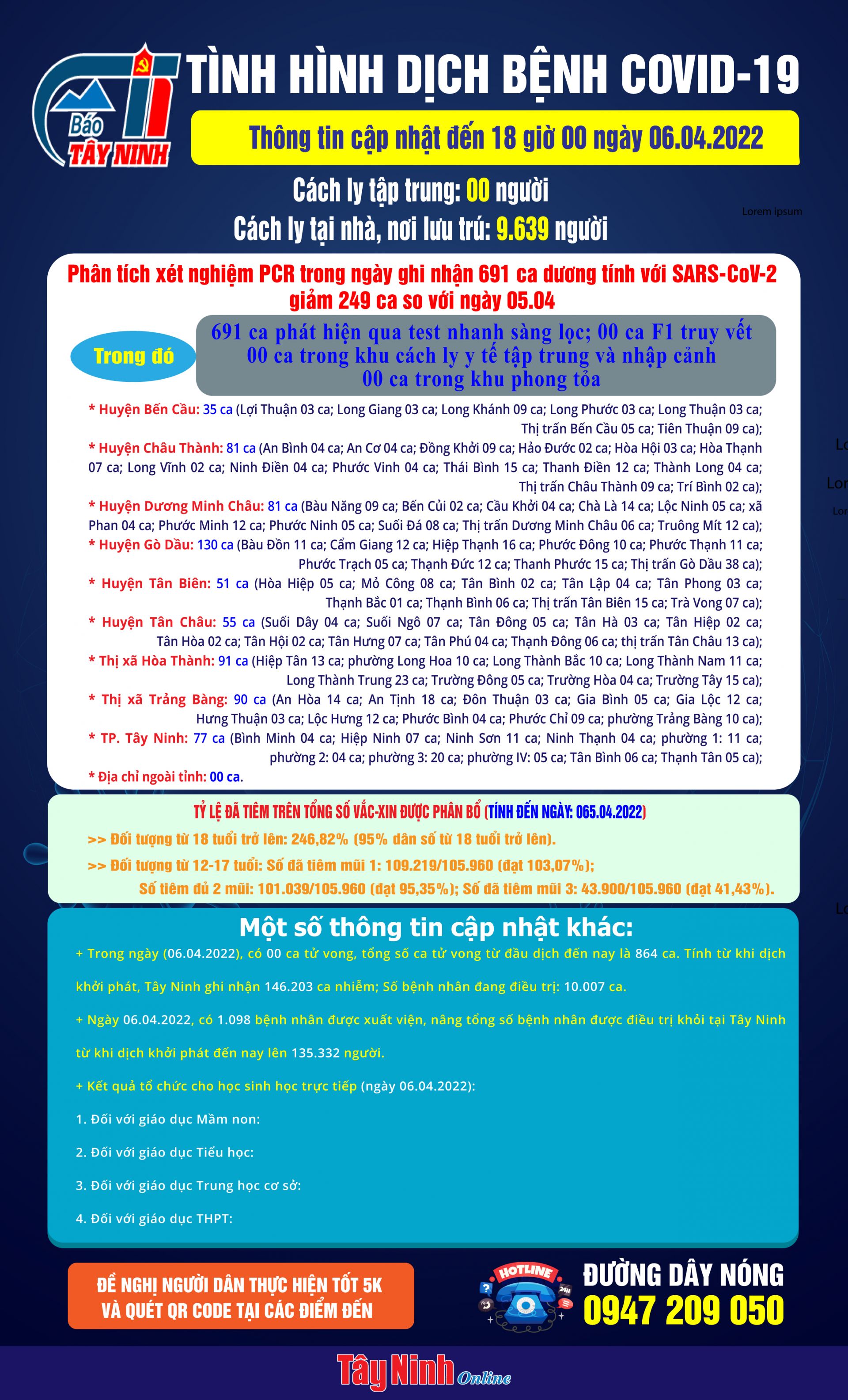Ngày 06.04.2022, có 1.098 bệnh nhân được xuất viện, nâng tổng số bệnh nhân được điều trị khỏi tại Tây Ninh từ khi dịch khởi phát đến nay lên 135.332 người.