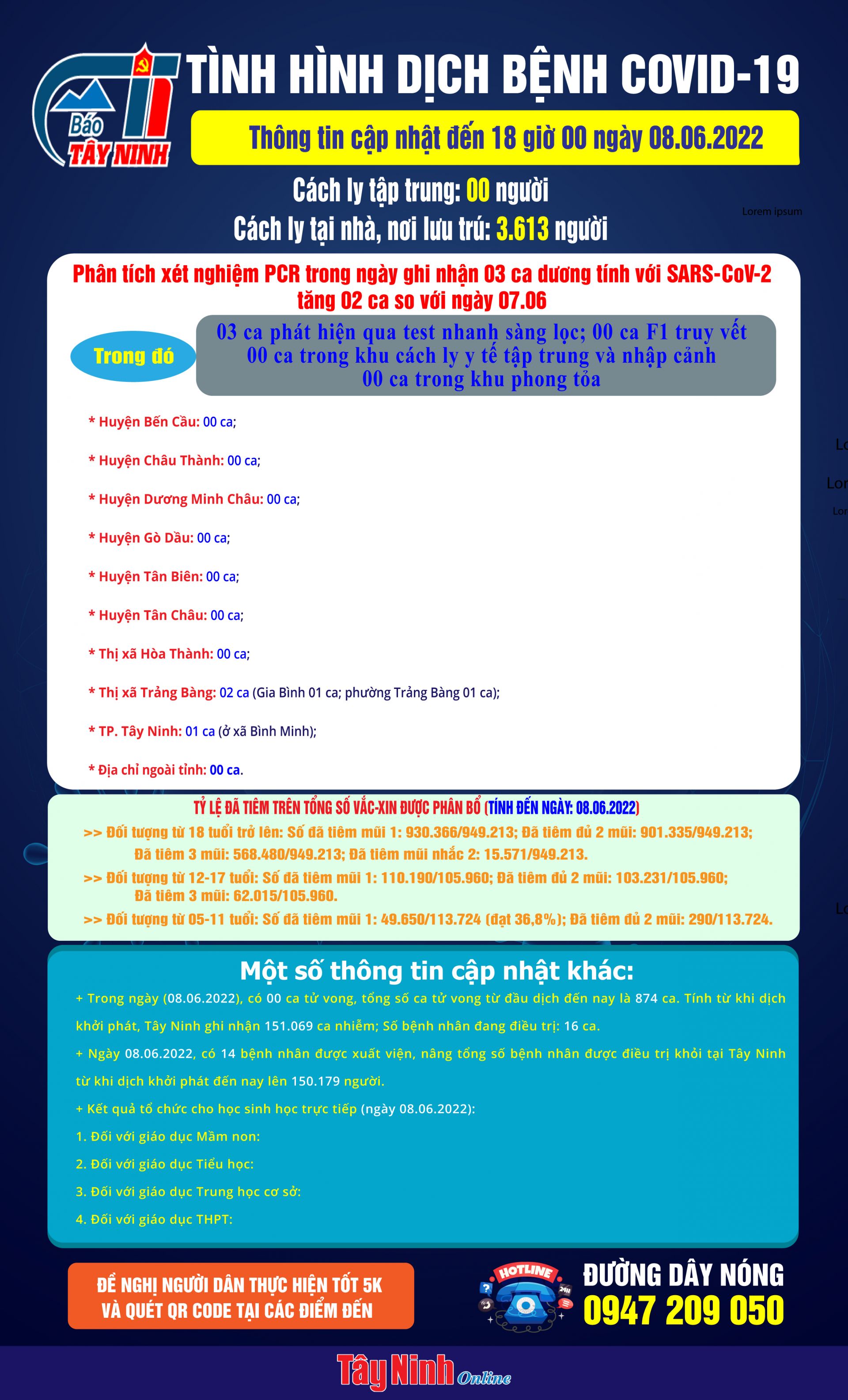 Ngày 08.06.2022, có 14 bệnh nhân được xuất viện, nâng tổng số bệnh nhân được điều trị khỏi tại Tây Ninh từ khi dịch khởi phát đến nay lên 150.179 người.