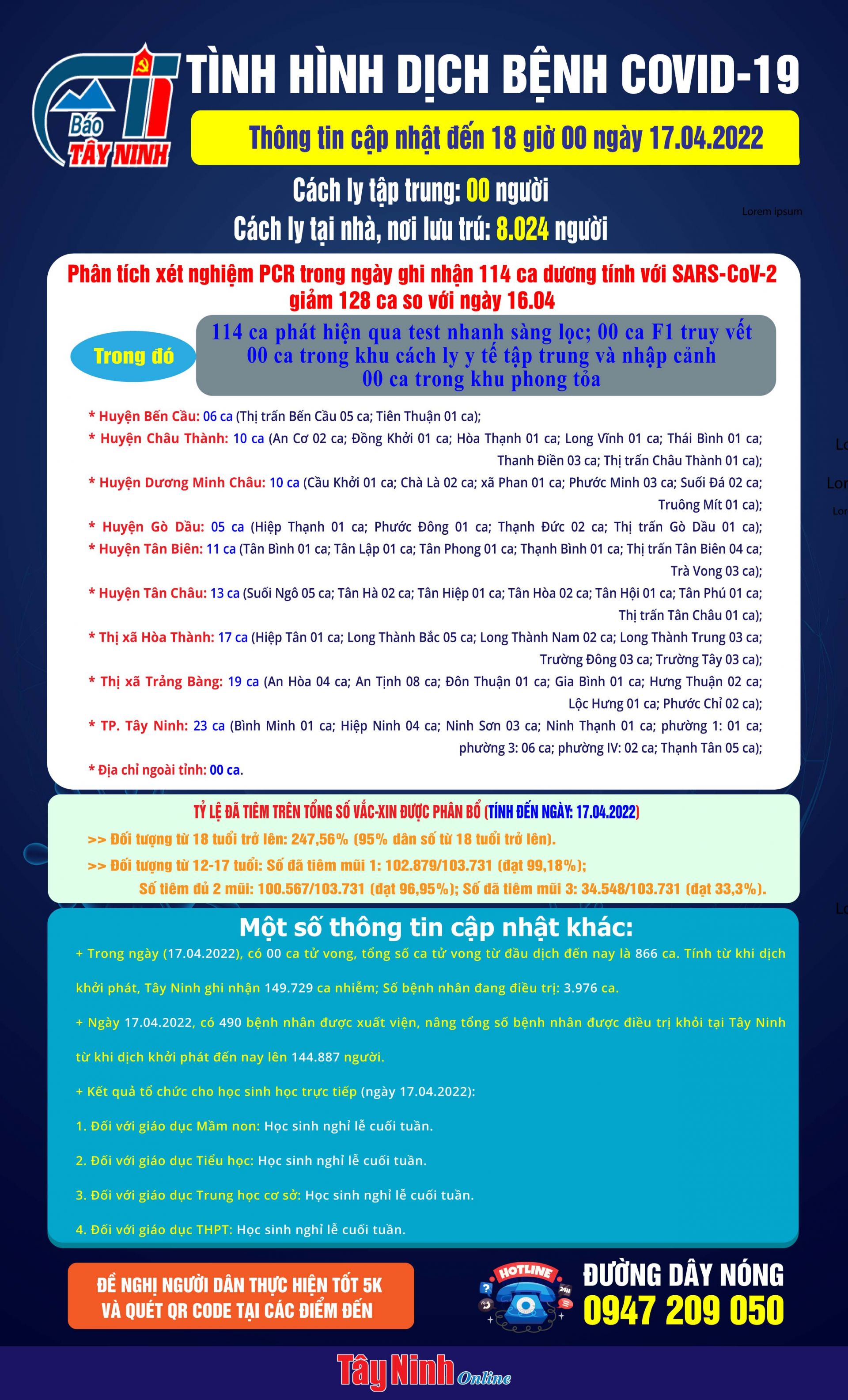 Ngày 17.04.2022, có 490 bệnh nhân được xuất viện, nâng tổng số bệnh nhân được điều trị khỏi tại Tây Ninh từ khi dịch khởi phát đến nay lên 144.887 người.