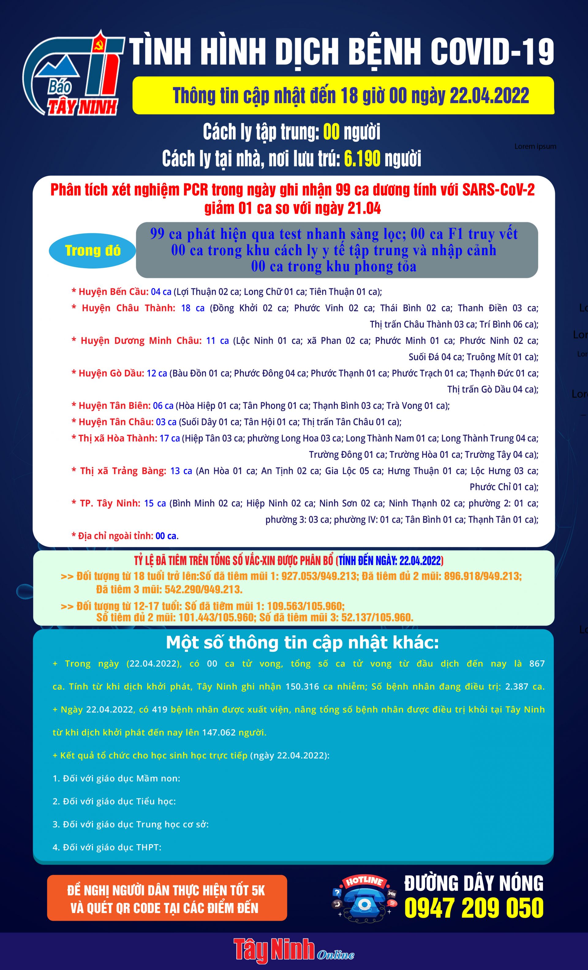 Ngày 22.04.2022, có 419 bệnh nhân được xuất viện, nâng tổng số bệnh nhân được điều trị khỏi tại Tây Ninh từ khi dịch khởi phát đến nay lên 147.062 người.
