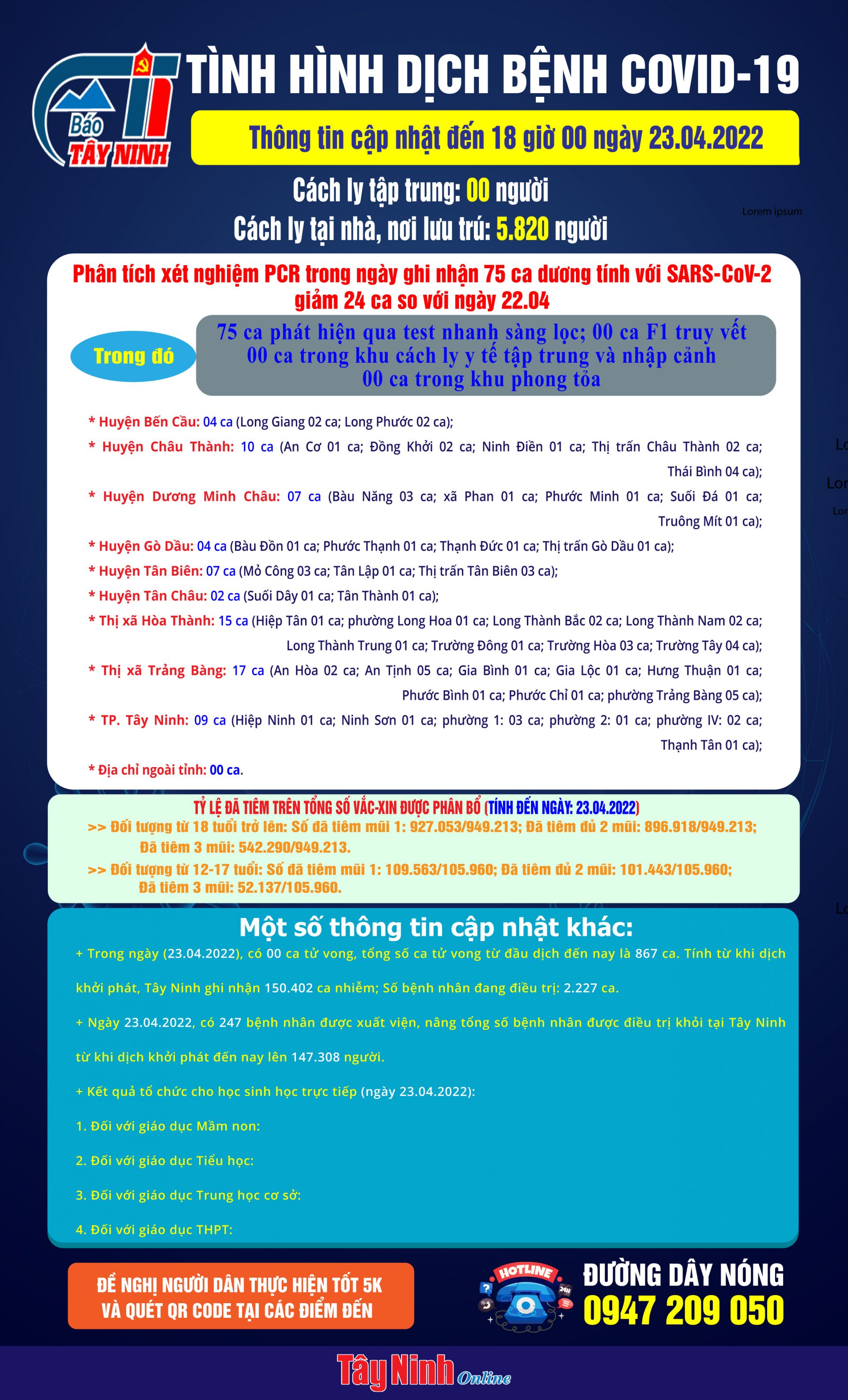 Ngày 23.04.2022, có 247 bệnh nhân được xuất viện, nâng tổng số bệnh nhân được điều trị khỏi tại Tây Ninh từ khi dịch khởi phát đến nay lên 147.308 người.