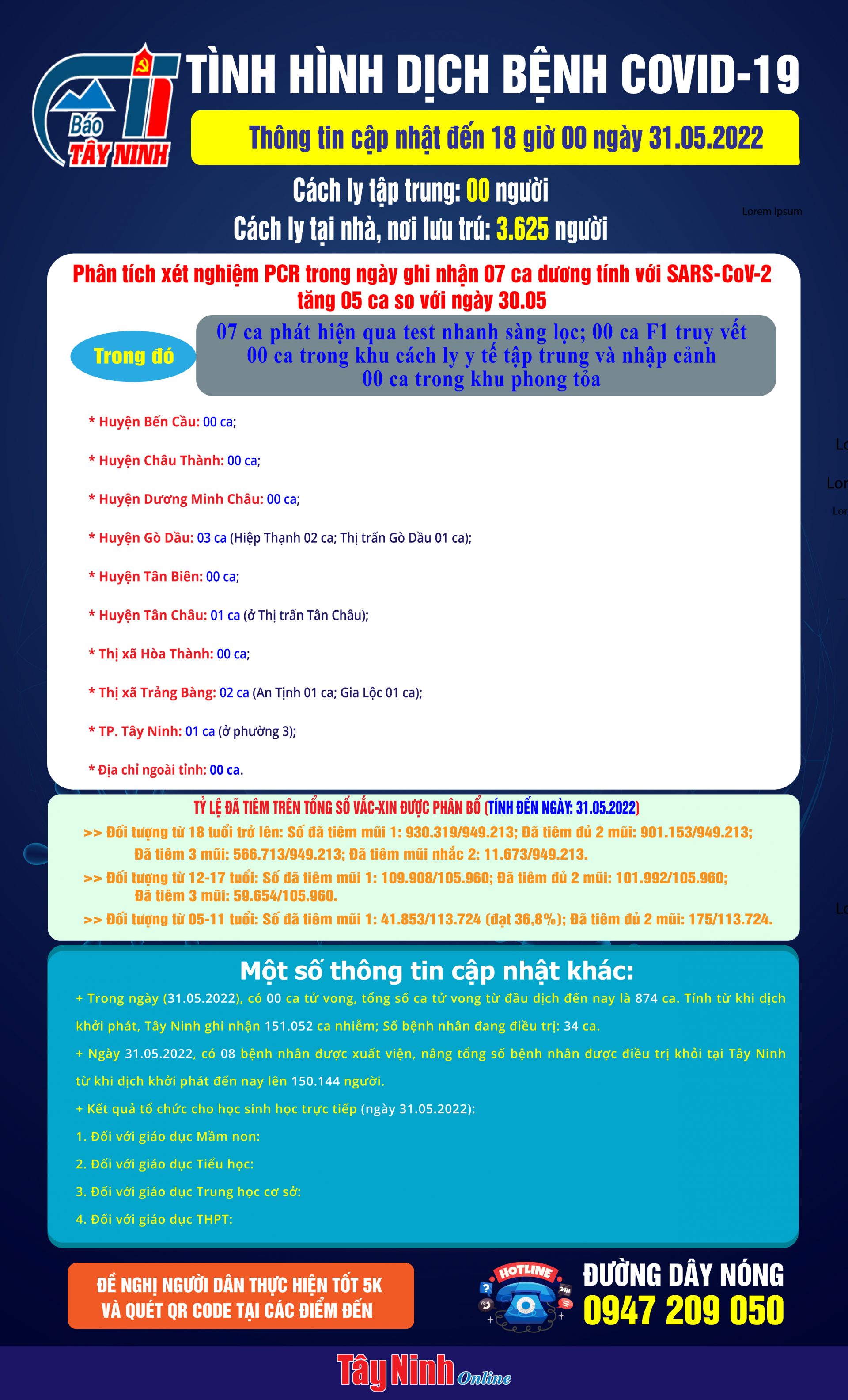 Ngày 31.05.2022, có 08 bệnh nhân được xuất viện, nâng tổng số bệnh nhân được điều trị khỏi tại Tây Ninh từ khi dịch khởi phát đến nay lên 150.144 người.