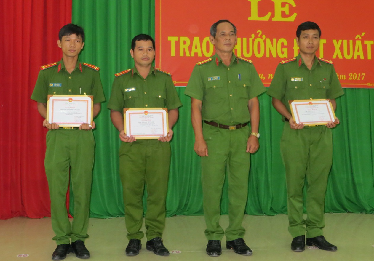 | Đại tá Lý Hồng Sinh- Phó Giám đốc CATN trao giấy khen cho cán bộ, chiến sĩ CA huyện Tân Châu. |
