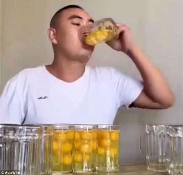 Theo báo chí Trung Quốc, tiết mục biểu diễn livestream của chàng trai này đã đạt 2 triệu lượt xem vào thời điểm đăng tải. Chàng trai đã uống 10 cốc thuỷ tinh, mỗi cốc chứa 10 quả trứng sống trong vòng 53 giây.