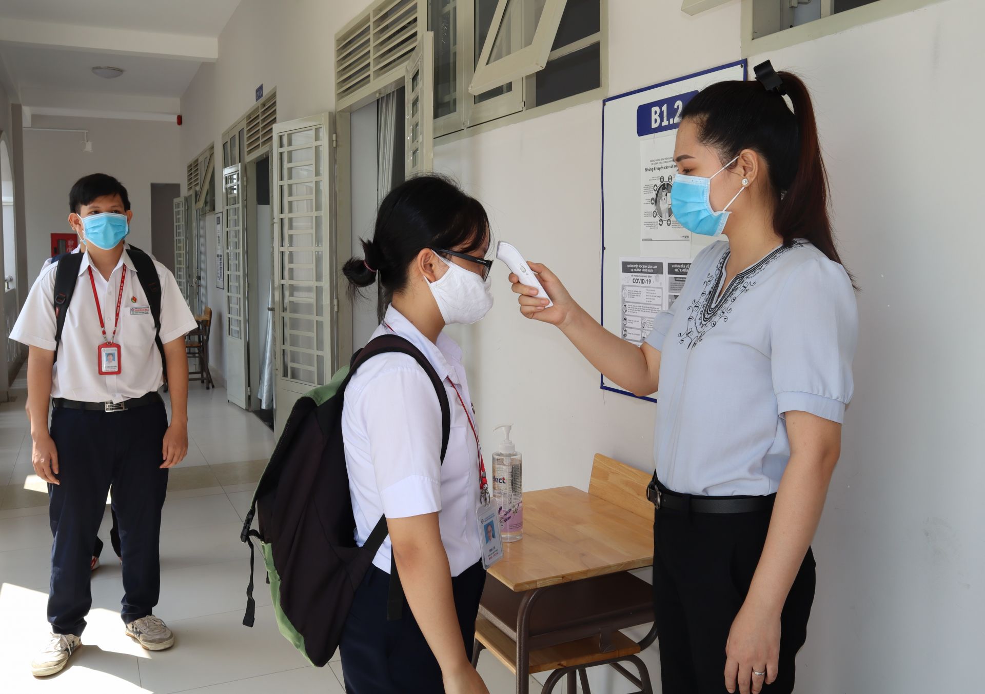 Cán bộ y tế Trường THPT chuyên Hoàng Lê Kha đo thân nhiệt cho học sinh trước cửa lớp. (Ảnh Ngọc Bích)