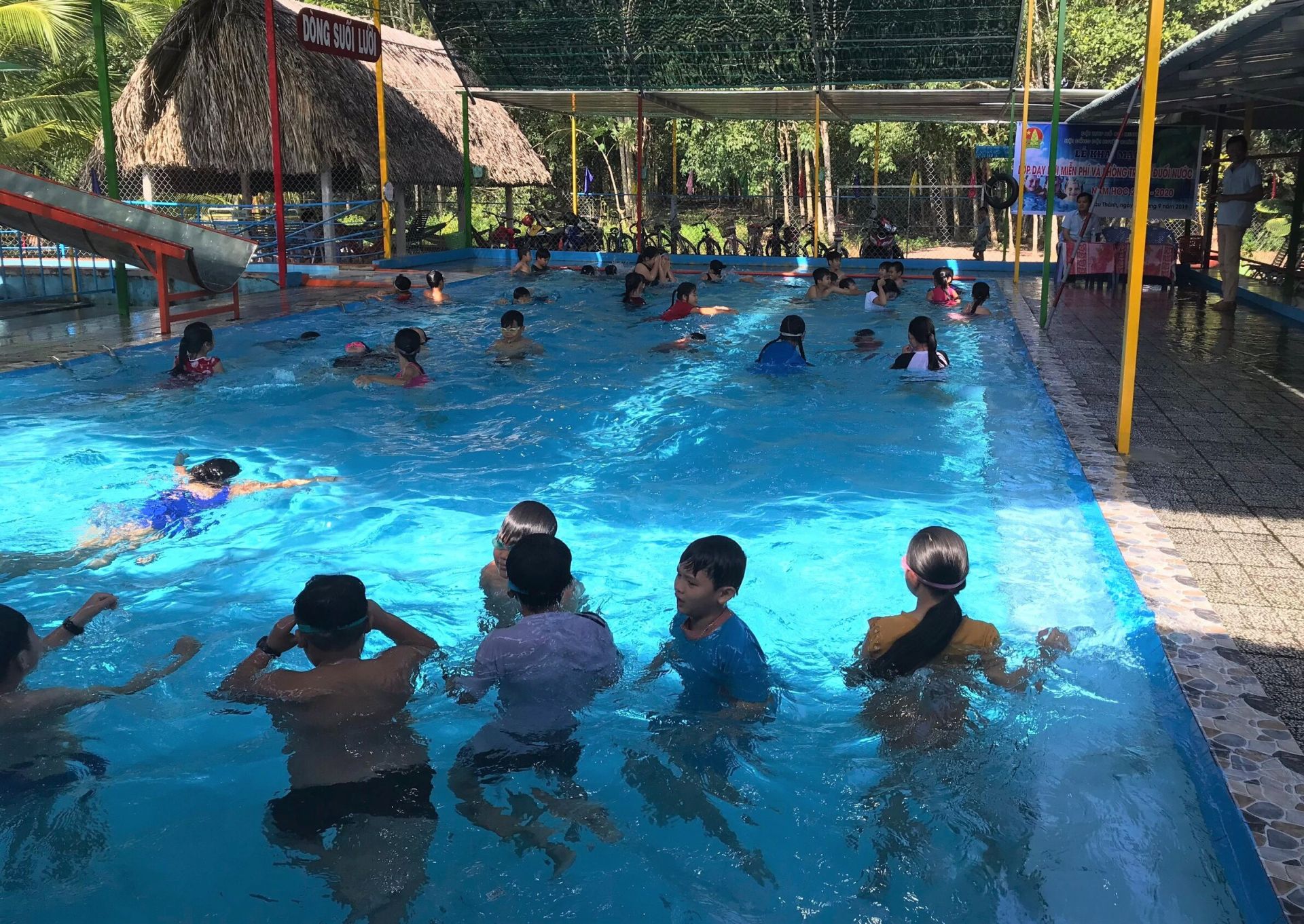 Trẻ em tham gia lớp học bơi miễn phí.