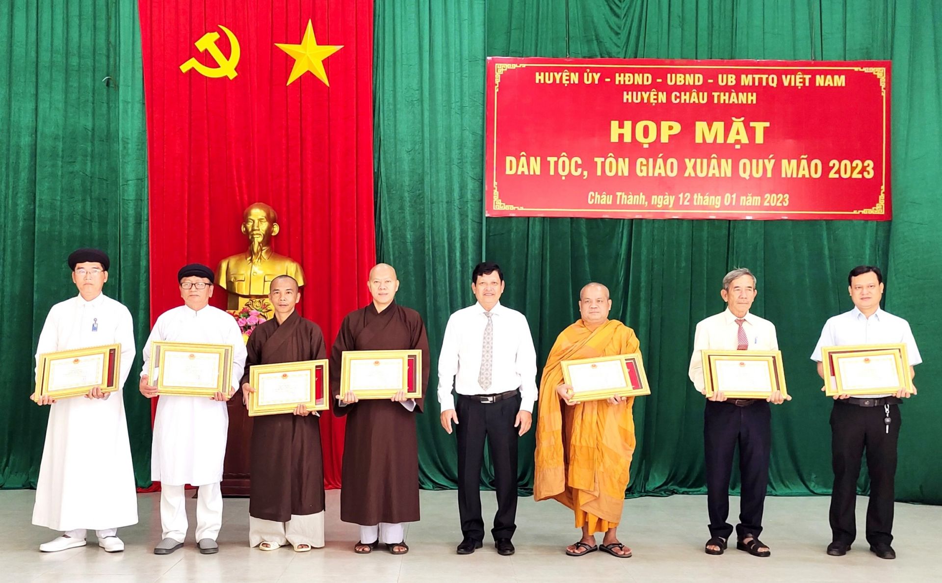 Dịp này, UBND huyện Châu Thành khen thưởng cho 7 tập thể và 3 cá nhân vì đã có thành tích trong công tác tôn giáo, dân tộc năm 2022.