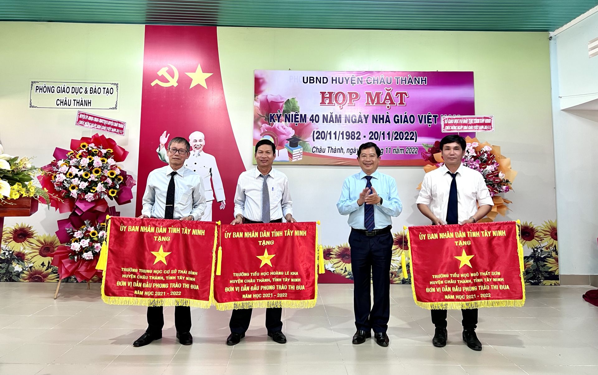Tại buổi họp mặt, ông Phạm Ngọc Hải- Giám đốc Sở Giáo dục và Đào tạo trao cờ cho 3 tập thể đạt thành tích xuất sắc, dẫn đầu phong trào thi đua ngành Giáo dục và Đào tạo huyện năm học 2021 - 2022; khen thưởng danh hiệu tập thể Lao động xuất sắc cho 13 tập thể.