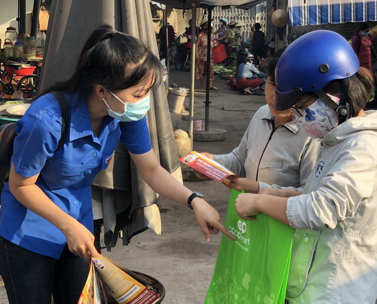 Phát túi thân thiện môi trường và tờ rơi tuyên truyền phòng chống dịch bệnh cho người dân.