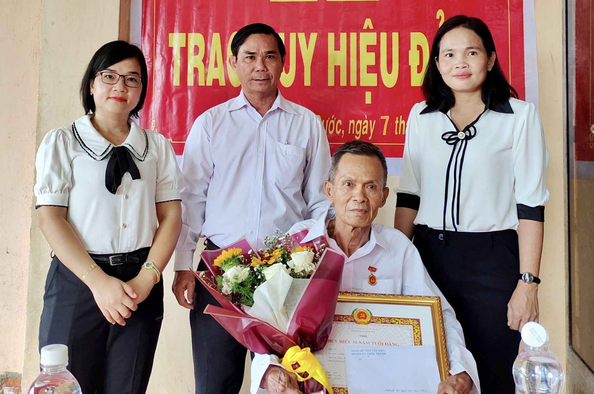 Chiều 7.8, ông Thân Văn Nhân- Phó Bí thư Thường trực Huyện uỷ Châu Thành đến nhà riêng trao Huy hiệu 50 năm tuổi Đảng cho đảng viên Nguyễn Văn Đúng thuộc Đảng bộ xã Hảo Đước.