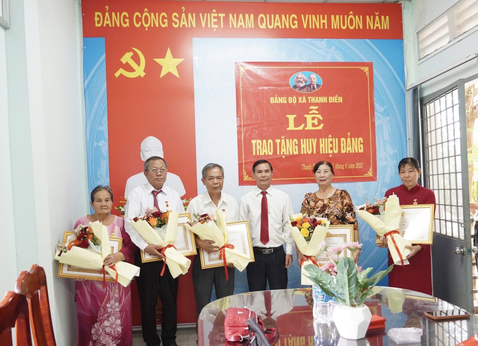 Huy hiệu 40 năm tuổi Đảng được trao cho đảng viên Lê Văn Tuấn (vào Đảng ngày 30.5.1985), hiện sinh hoạt tại Chi bộ ấp Thanh Hùng và đảng viên Nguyễn Văn Sở (vào Đảng ngày 5.5.1985), hiện sinh hoạt tại Chi bộ ấp Thanh Sơn.