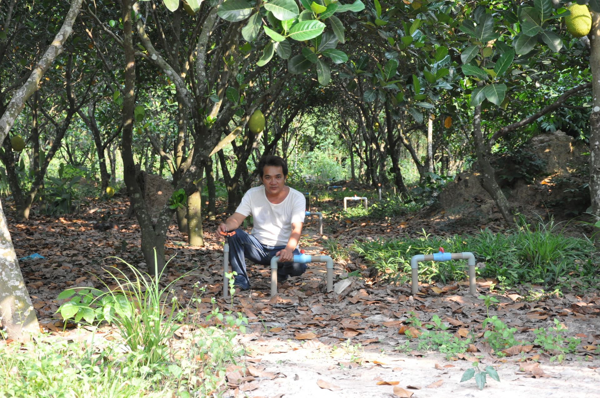 Nông dân Phan Văn Dũng trong vườn mít được hình thành nhờ vào nguồn vốn vay của Ngân hàng CSXH huyện