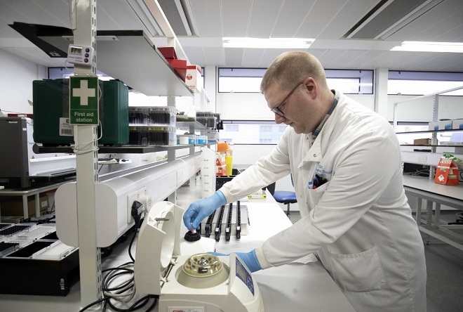 Kỹ thuật viên tại Bệnh viện Hoàng gia Glasgow trích xuất virus từ các mẫu bệnh phẩm để phân tích và xác định cấu trúc di truyền. Ảnh: AFP