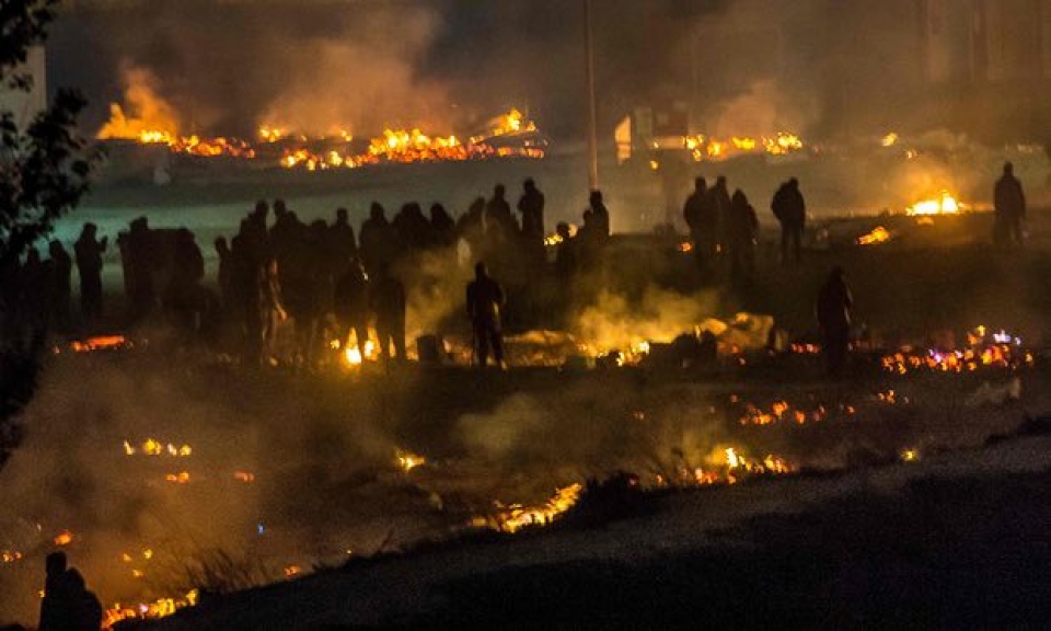 Người tị nạn đang di tản khi ngọn lửa khổng lồ bao trùm một nửa trại Grande-Synthe. (Nguồn: AFP)