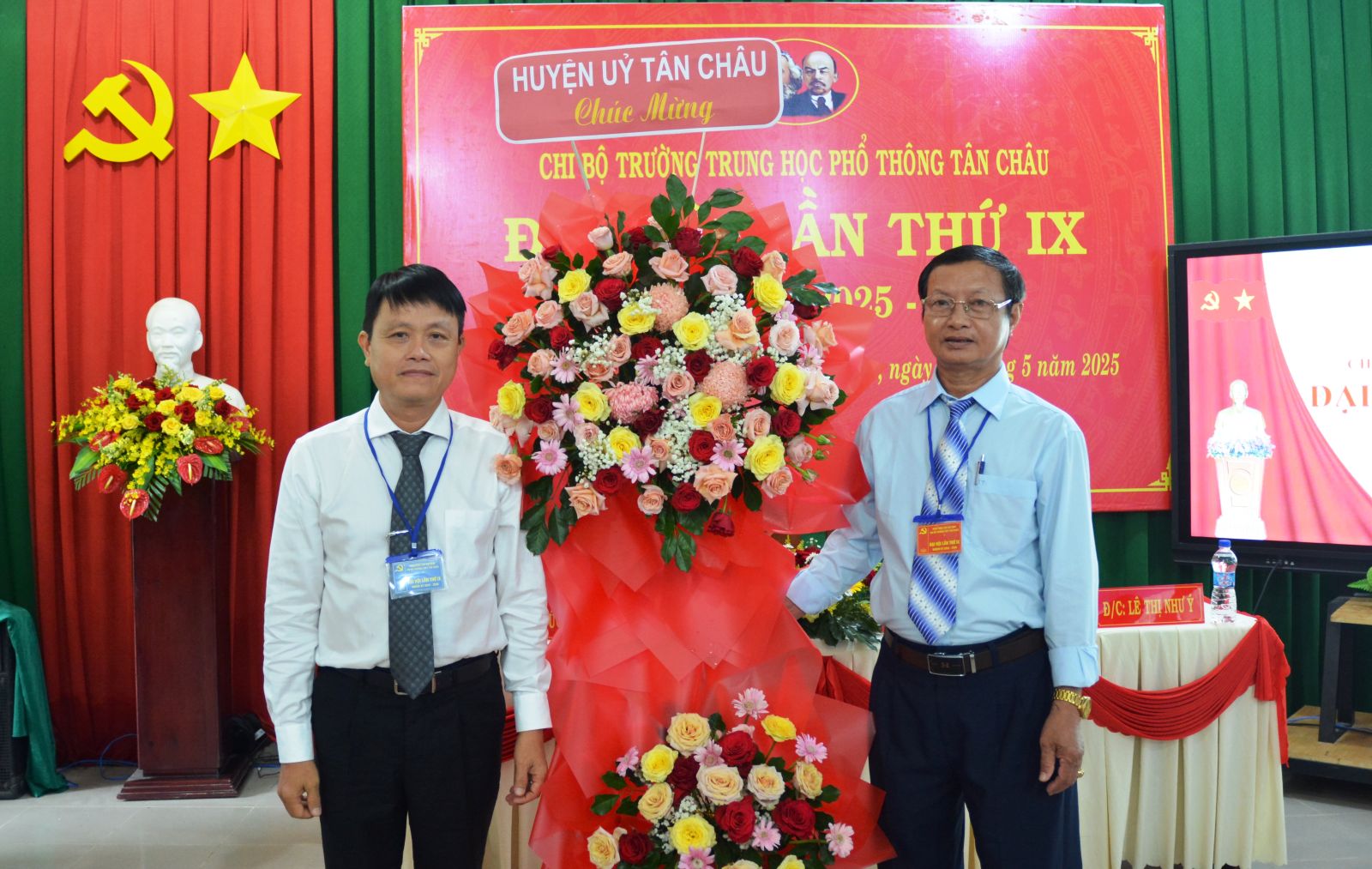 Chi bộ Trường THPT Tân Châu có 37 đảng viên. Trong nhiệm kỳ qua, chi bộ đã chỉ đạo thực hiện thắng lợi Nghị quyết Đại hội nhiệm kỳ 2020-2025 và đạt được những kết quả nổi bật. Chi bộ luôn quan tâm công tác xây dựng Đảng, bảo đảm sự đoàn kết thống nhất trong nội bộ; kết nạp 9 đảng viên mới, trong đó, có 6 đảng viên là giáo viên và 3 đảng viên là học sinh.