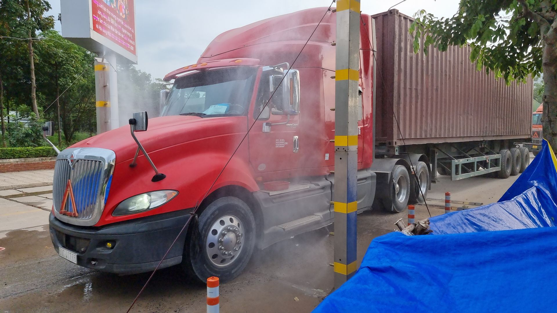 Phương tiện vận tải được phun sát khuẩn tự động khi qua cửa khẩu Mộc Bài.