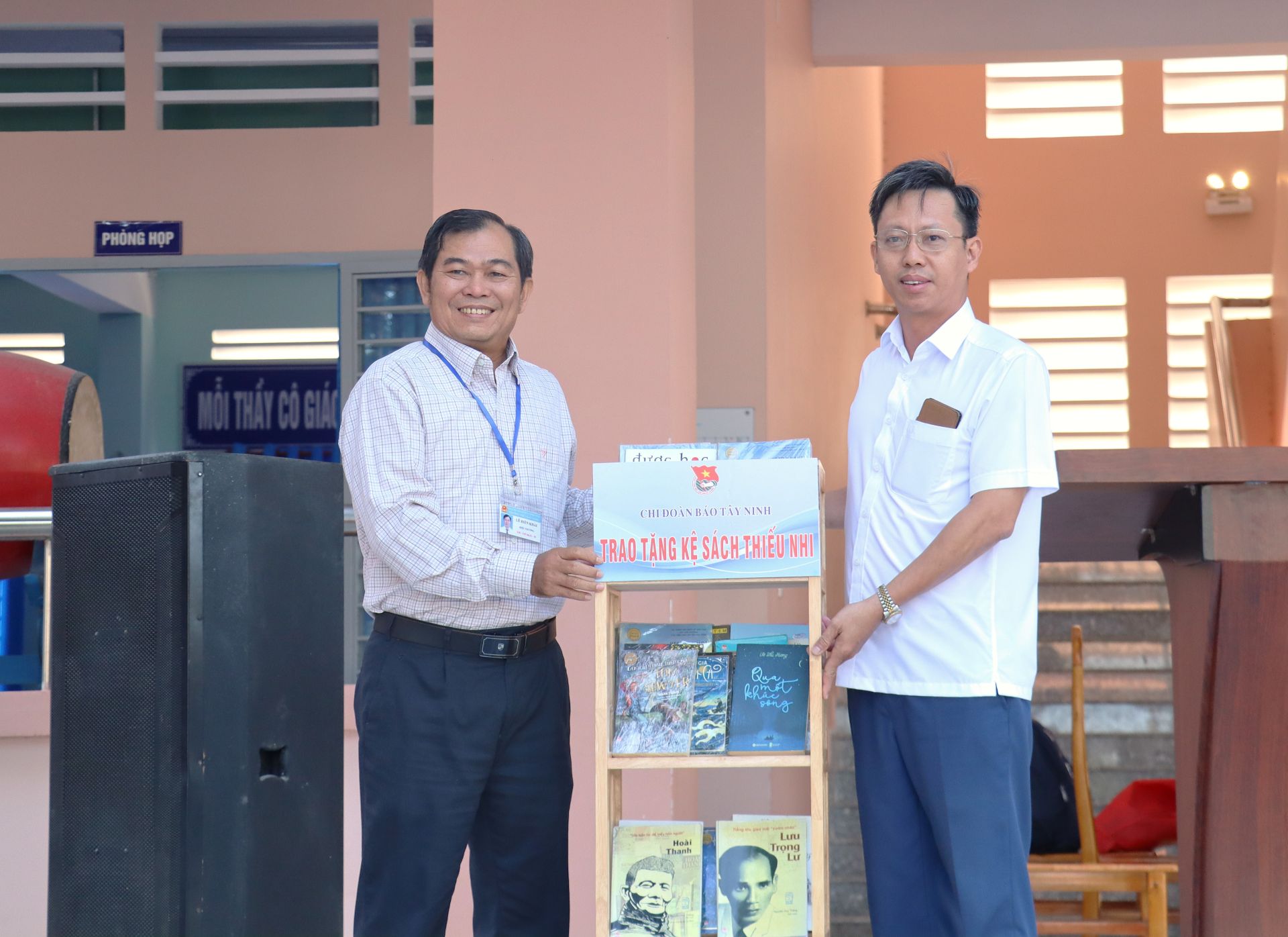 Ông Dương Nguyễn Hoàng Anh - Phó Tổng Biên tập Báo Tây Ninh (bên phải) đại diện Báo Tây Ninh trao tặng kệ sách thiếu nhi cho trường THCS Bàu Năng.