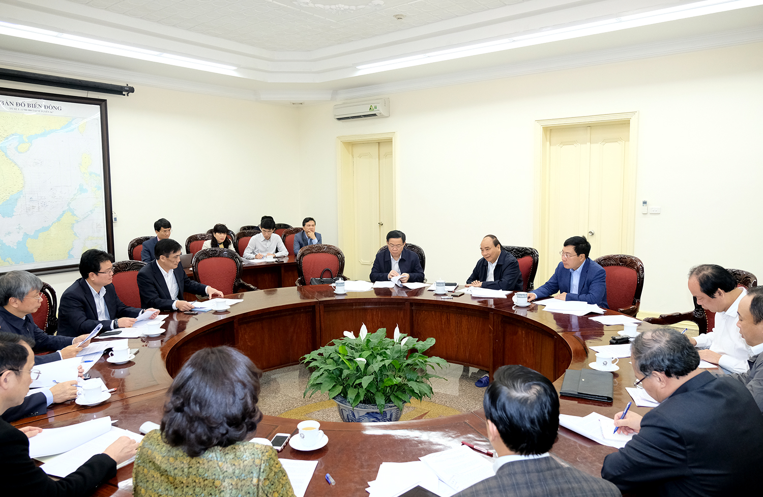 Thủ tướng Nguyễn Xuân Phúc, Phó Thủ tướng Phạm Bình Minh và Phó Thủ tướng Vương Đình Huệ tại cuộc họp. Ảnh: VGP/Quang Hiếu