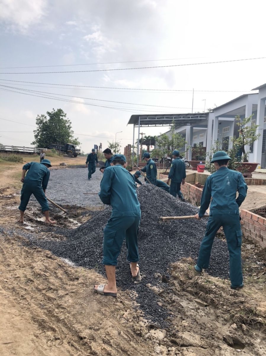 Cán bộ, chiến sĩ Ban CHQS xã Tiên Thuận tham gia công tác dân vận giặm vá đường giao thông nông thôn.