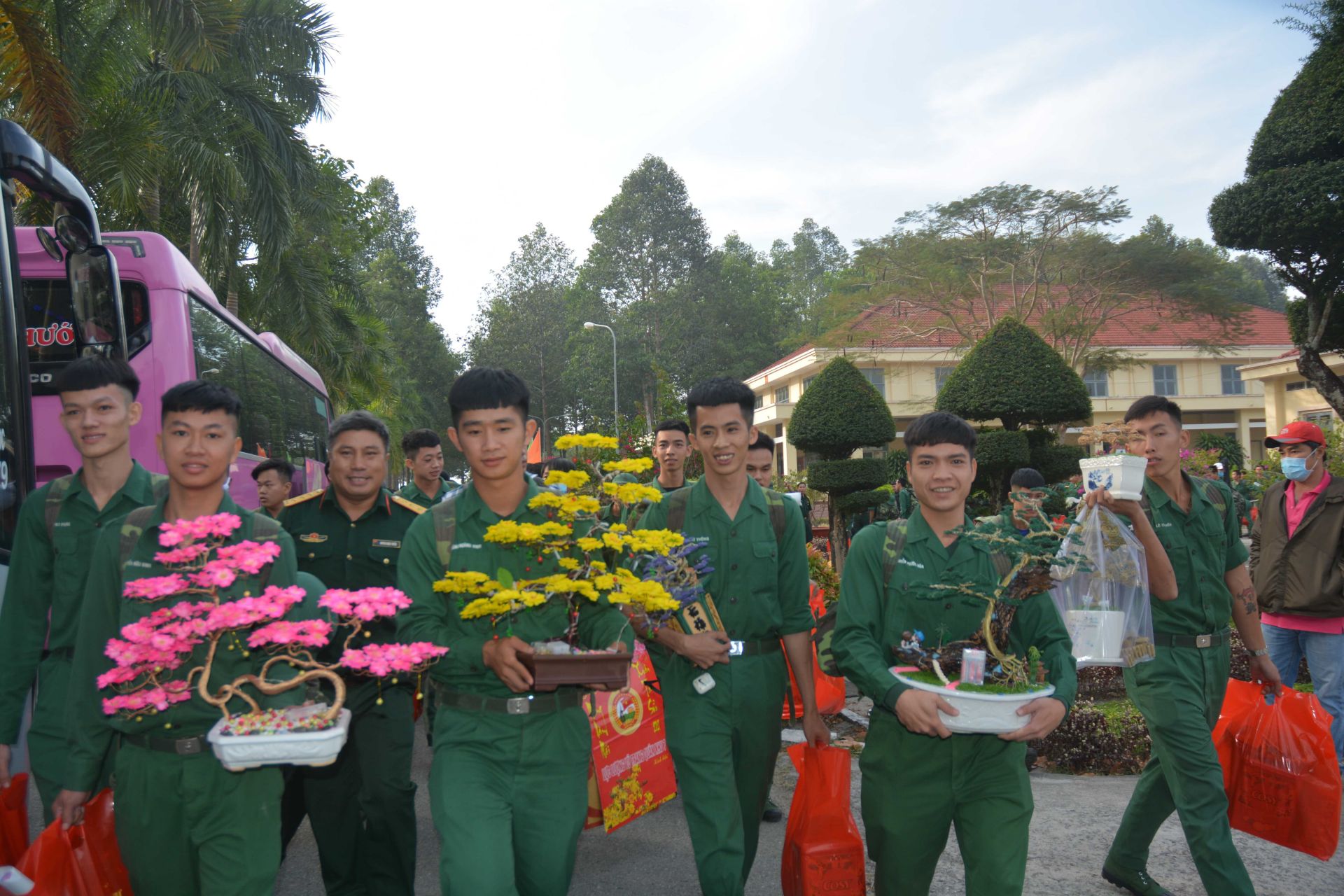 Trong khuôn viên Tiểu đoàn 14, đỏ rực cờ hoa và băng rôn, hoà lẫn các loài hoa nở rộ khoe sắc. Bộ CHQS tỉnh tổ chức tiễn 485 quân nhân hoàn thành nhiệm vụ trong quân đội trong không khí ấm áp tình đồng chí, đồng đội. Sự bịn rịn, lưu luyến thể hiện rõ qua những cái bắt tay thật chặt giữa người về – người ở, giữa chỉ huy và chiến sĩ, khiến mọi người không kiềm được xúc động.