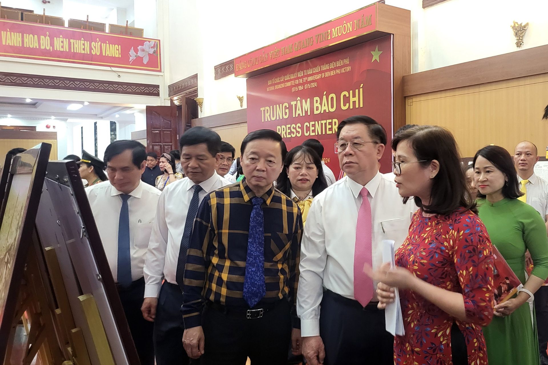 Trưởng Ban Tuyên giáo Trung ương Nguyễn Trọng Nghĩa và các đại biểu tham quan các hiện vật được trưng bày tại Trung tâm báo chí kỷ niệm 70 năm chiến thắng Điện Biên phủ. Ảnh T.Tuấn