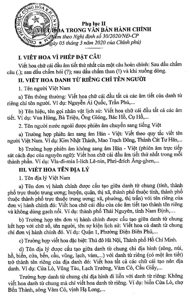Quy định mới về viết hoa được đưa ra trong Nghị định 30 về công tác văn thư. Chi tiết cách viết hoa nằm ở phụ lục II.