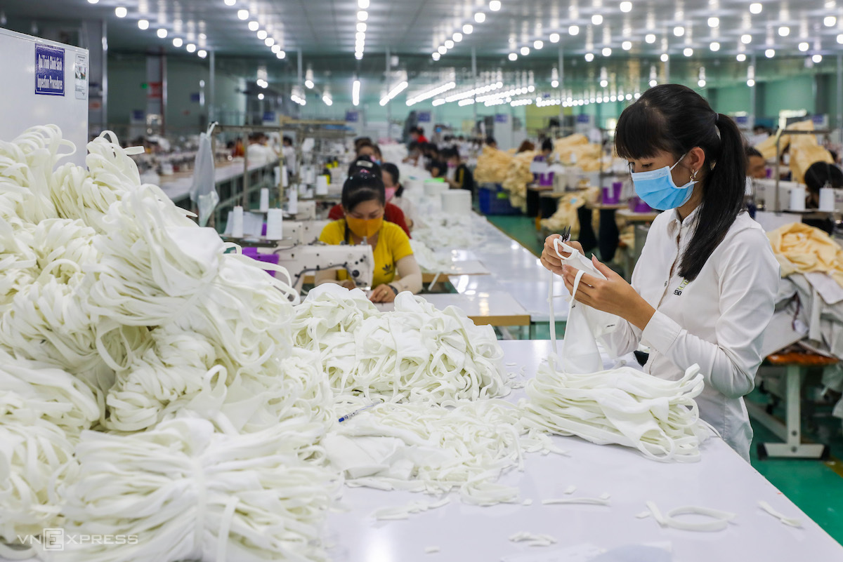 Công nhân trong một công ty ở KCN Tân Đô, Long An sản xuất khẩu trang vải. Ảnh: Quỳnh Trần