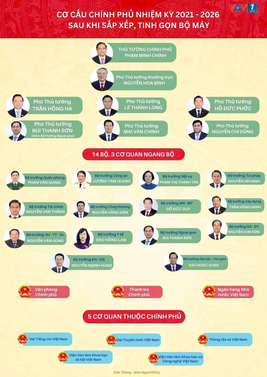 Theo đó, cơ cấu tổ chức của Chính phủ nhiệm kỳ 2021 – 2026 có 17 bộ ngành gồm 14 bộ và 3 cơ quan ngang bộ, giảm 5 bộ ngành so với trước đây.