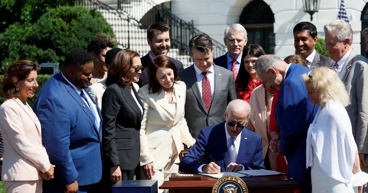 Tổng thống Mỹ Joe Biden ký đạo luật CHIPS hồi tháng 8/2022 để nâng cao năng lực sản xuất chip trong nước của Mỹ. Ảnh: Reuters.[Chip anh 4]