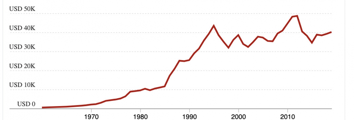 GPD đầu người của Nhật Bản trong giai đoạn 1970-2020 (Nguồn WB).