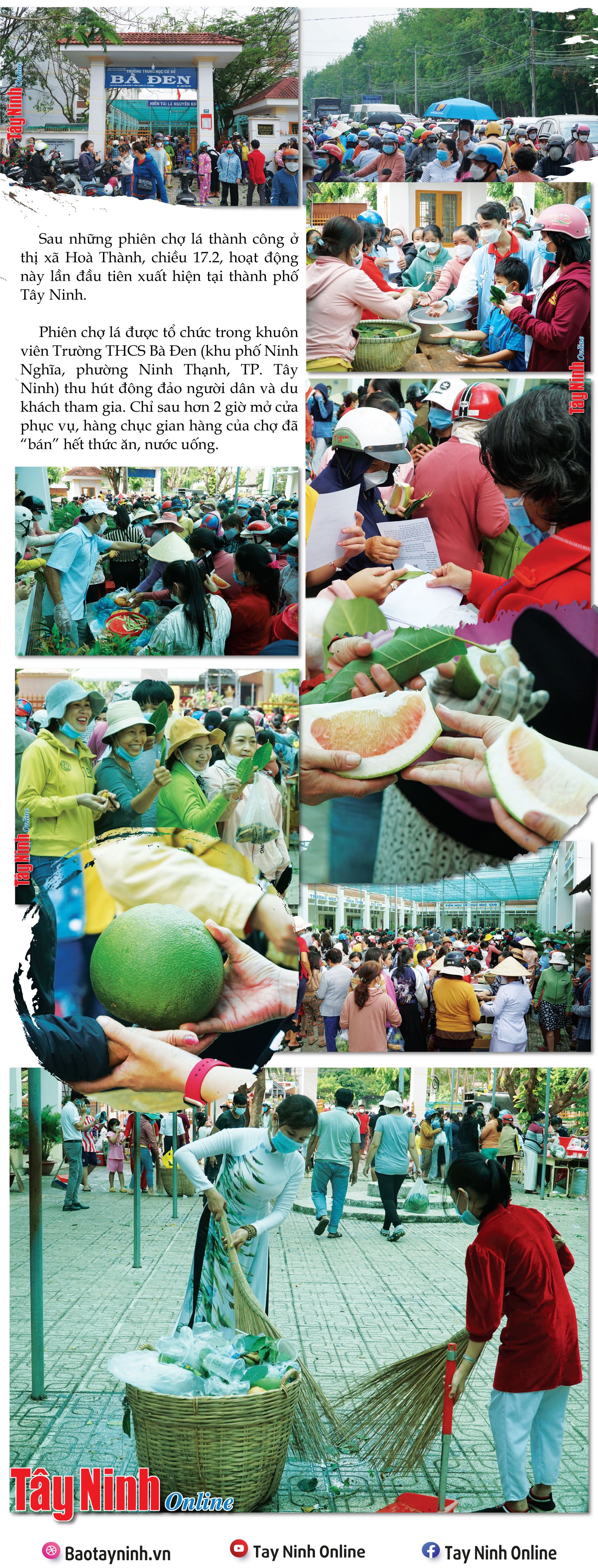 Phiên chợ lá được tổ chức trong khuôn viên Trường THCS Bà Đen (khu phố Ninh Nghĩa, phường Ninh Thạnh, TP. Tây Ninh) thu hút đông đảo người dân và du khách tham gia. Chỉ sau hơn 2 giờ mở cửa phục vụ, hàng chục gian hàng của chợ đã “bán” hết thức ăn, nước uống. |