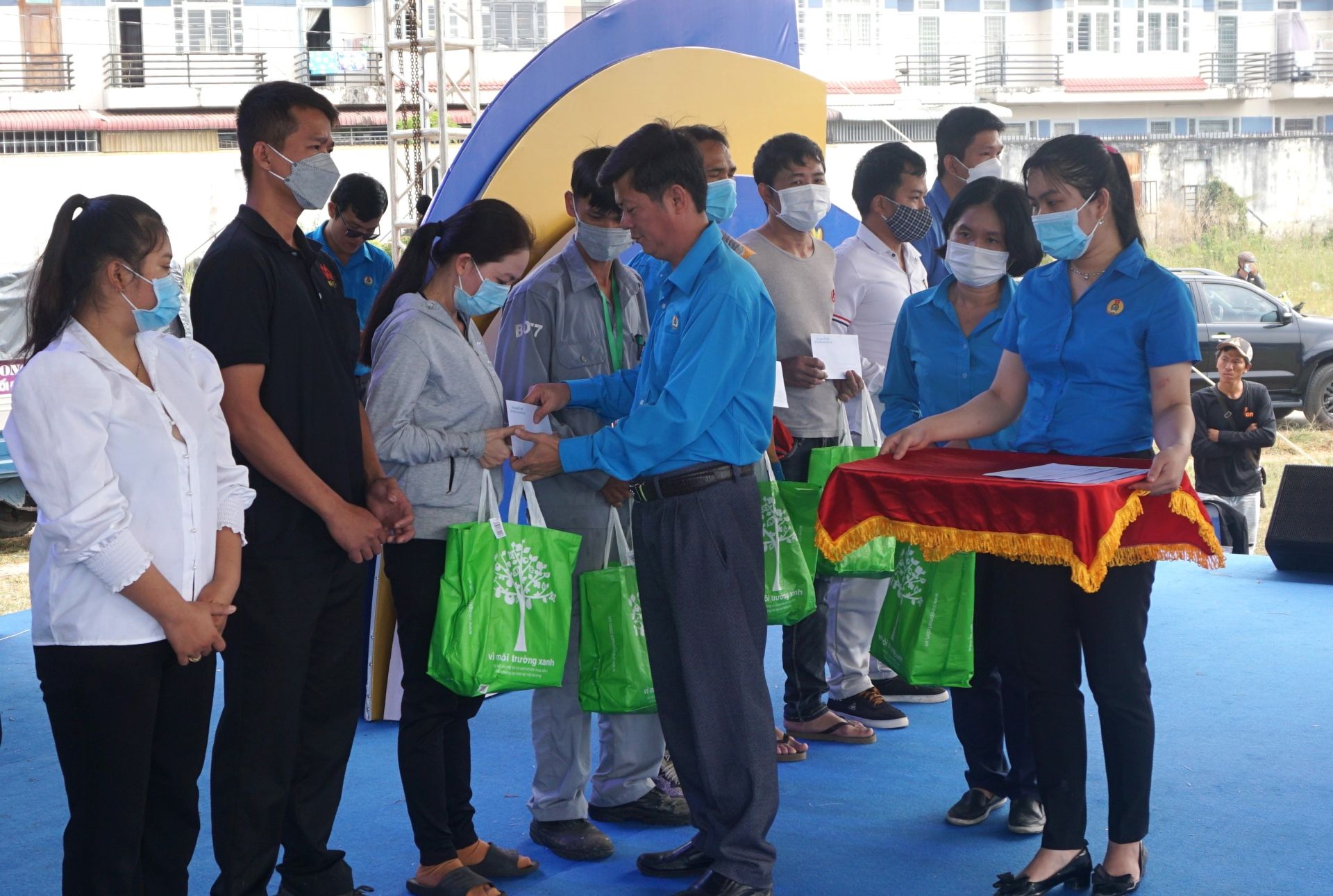 Ông Trần Lê Duy- Chủ tịch LĐLĐ tỉnh trao quà cho công nhân.