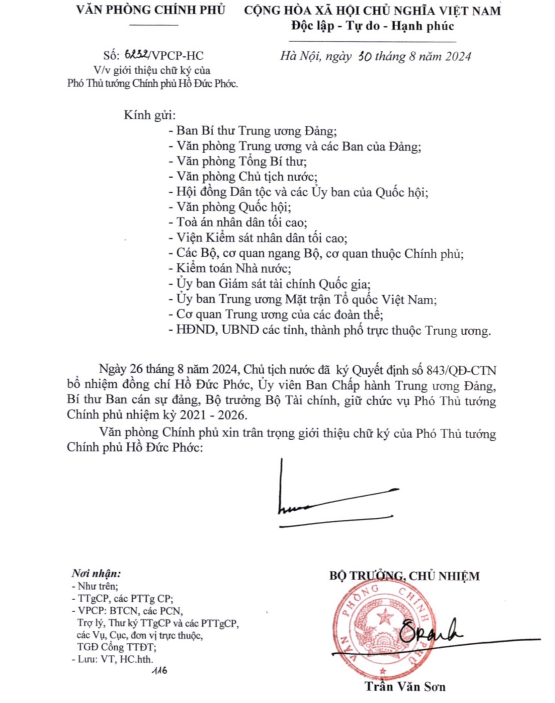 Ngày 26/8/2024, Chủ tịch nước đã ký Quyết định số 843/QĐ-CTN bổ nhiệm đồng chí Hồ Đức Phớc, Ủy viên Ban Chấp hành Trung ương Đảng, Bí thư Ban cán sự đảng, Bộ trưởng Tài chính giữ chức vụ Phó Thủ tướng Chính phủ nhiệm kỳ 2021 - 2026.