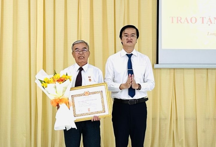 Huy hiệu 55 năm tuổi Đảng được trao cho đảng viên Tô Thanh (sinh năm 1949), nguyên Giám đốc Sở Văn hoá, Thể thao và Du lịch, hiện sinh hoạt Đảng tại Chi bộ khu phố 2, thuộc Đảng bộ phường Long Hoa.