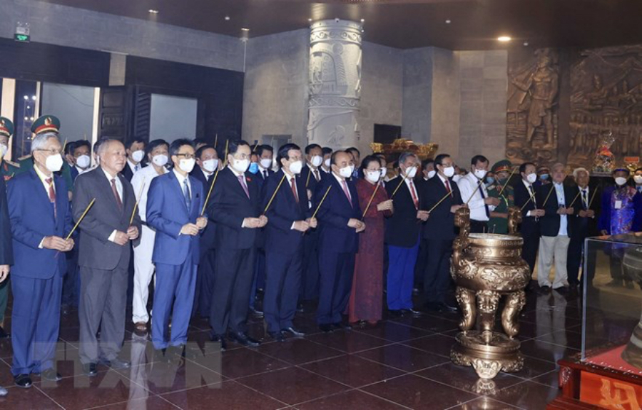 Trước đó, Chủ tịch nước Nguyễn Xuân Phúc và các đồng chí lãnh đạo, nguyên lãnh đạo Đảng, Nhà nước thành kính dâng hương tưởng nhớ công ơn các Vua Hùng tại đền thờ Vua Hùng thành phố Cần Thơ.