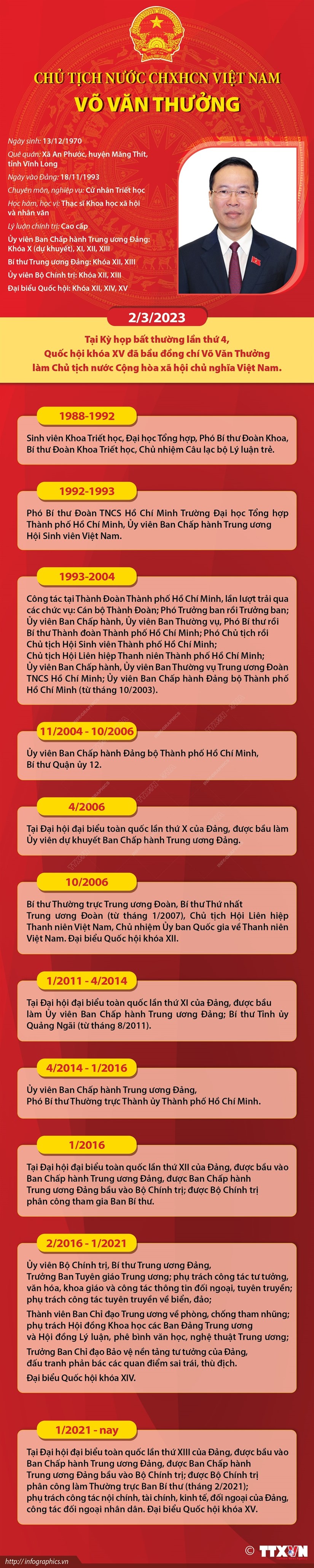Tại kỳ họp bất thường lần thứ 4, Quốc hội khoá XV sáng 2.3, Quốc hội đã bầu đồng chí Võ Văn Thưởng- Uỷ viên Bộ Chính trị, Thường trực Ban Bí thư giữ chức Chủ tịch nước Cộng hoà Xã hội chủ nghĩa Việt Nam nhiệm kỳ 2021-2026.